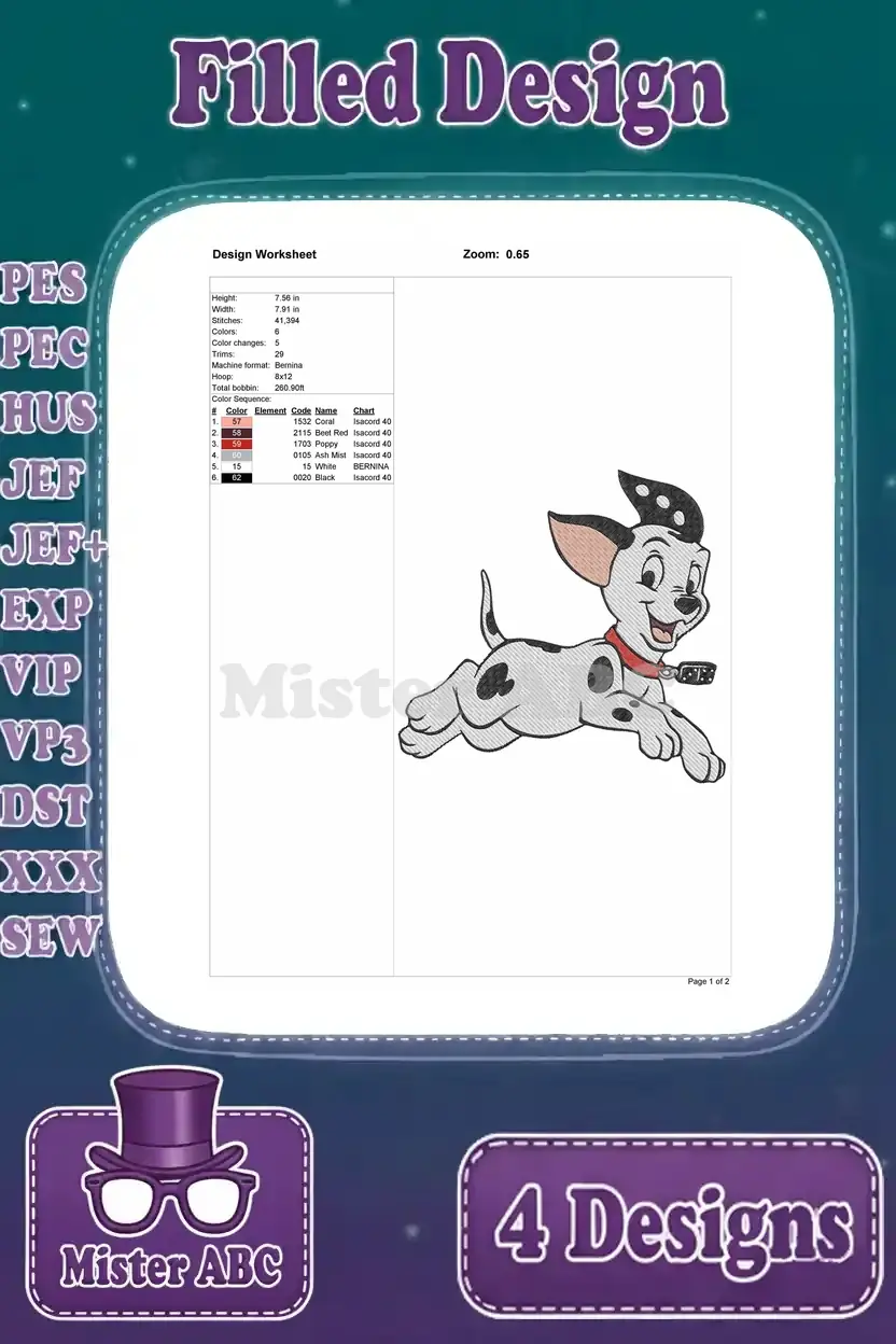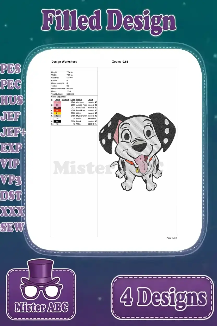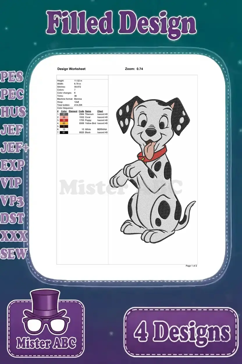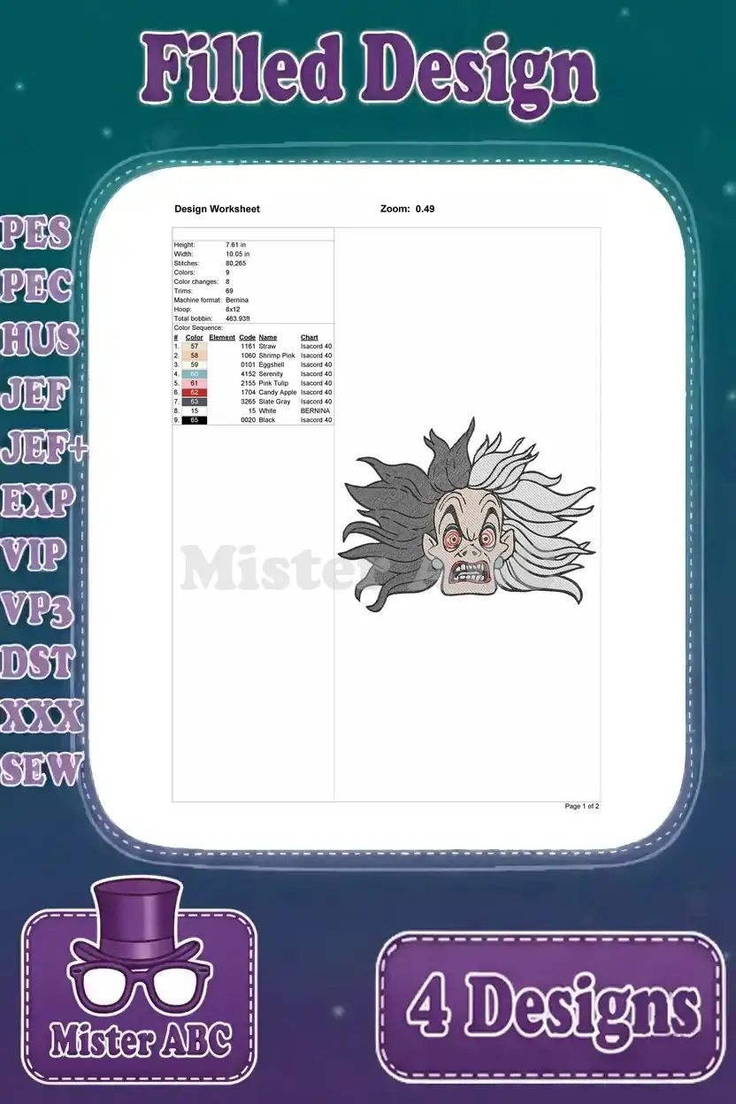 Disney 101 Dalmatians Cruella Furious Face Patch Lucky Puppies Set – Filled Embroidery Design