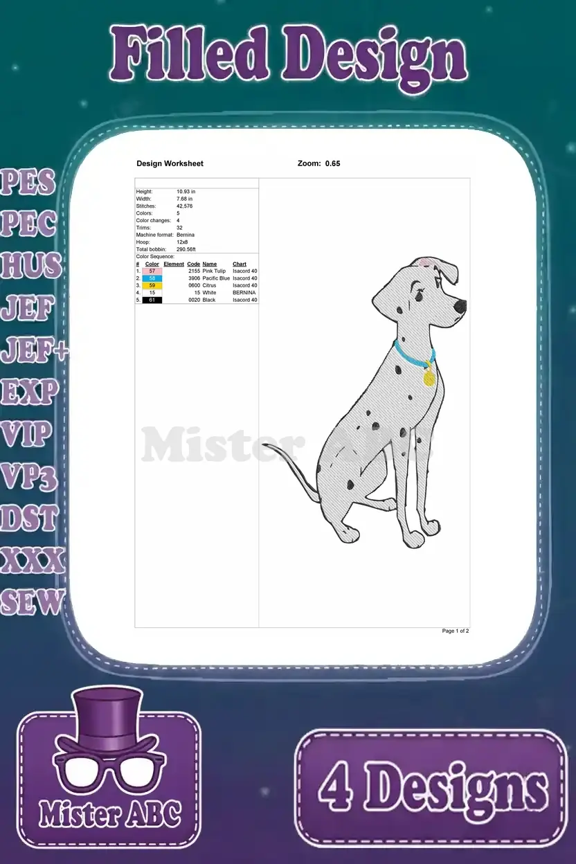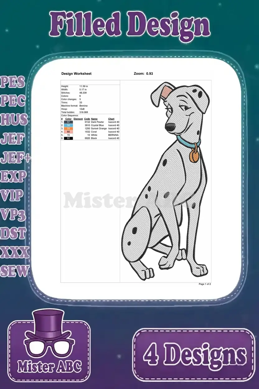 Disney 101 Dalmatians Pongo Perdita Adult Dogs Elegant Poses Sitting Standing – Filled Embroidery Design