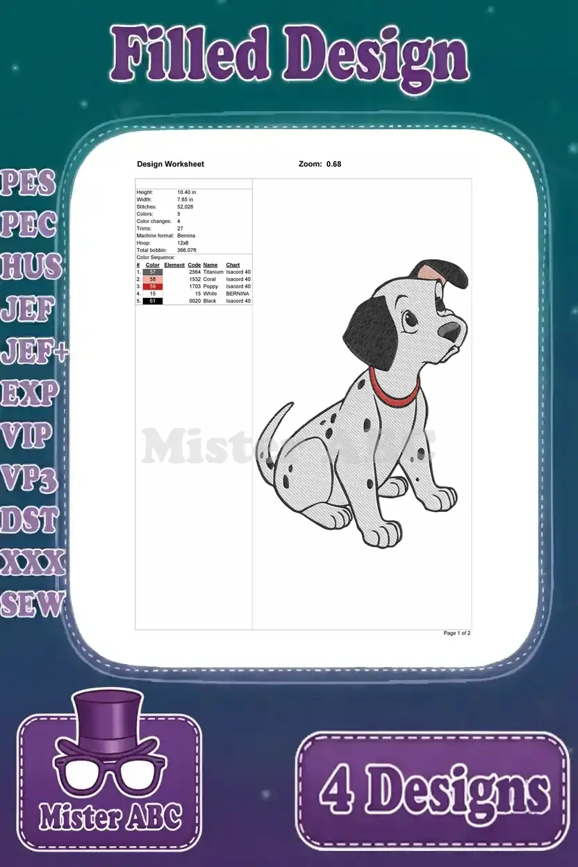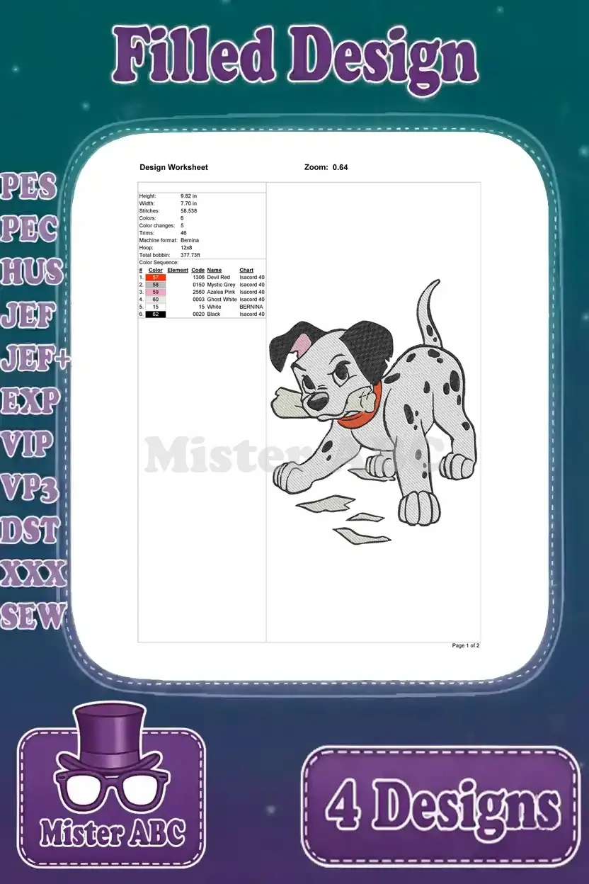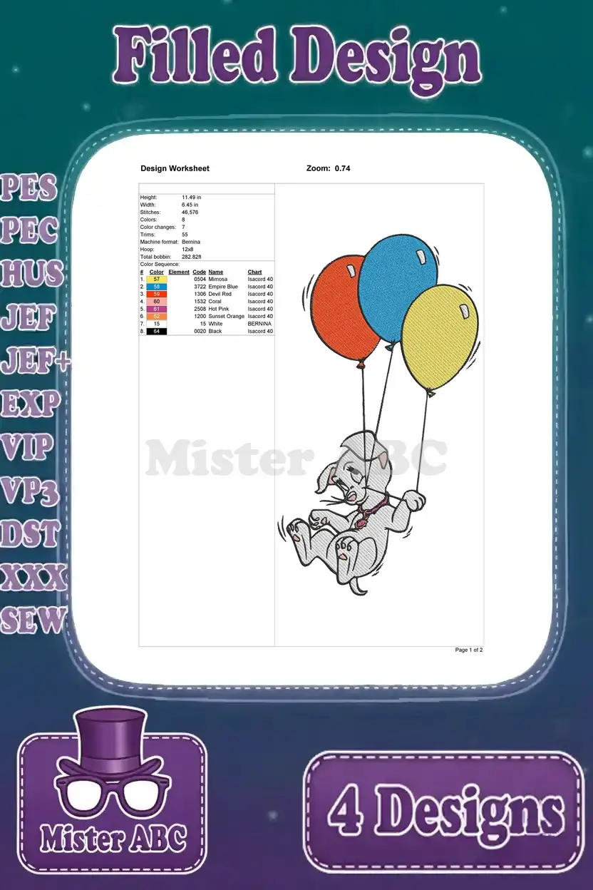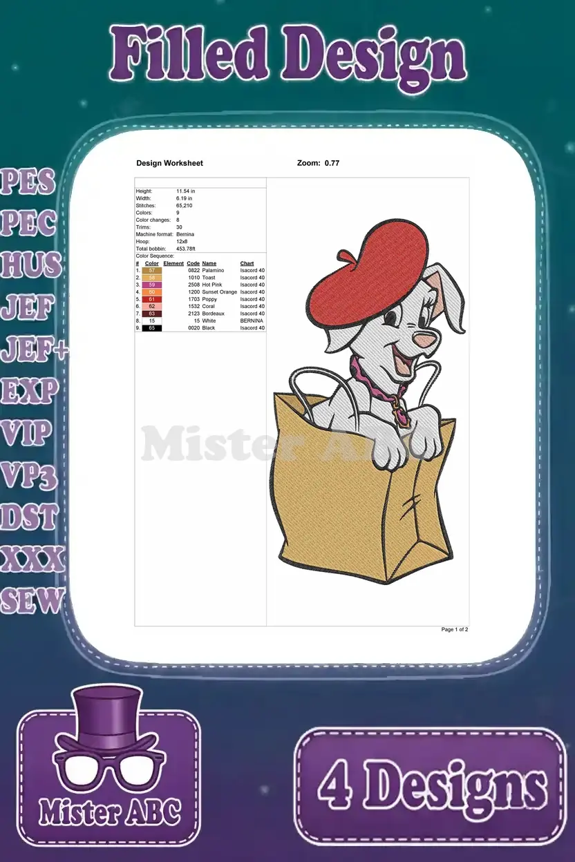 Disney 101 Dalmatians Puppy In Bag Parisian Pup Balloons Fun Adventure Designs – Filled Embroidery Design