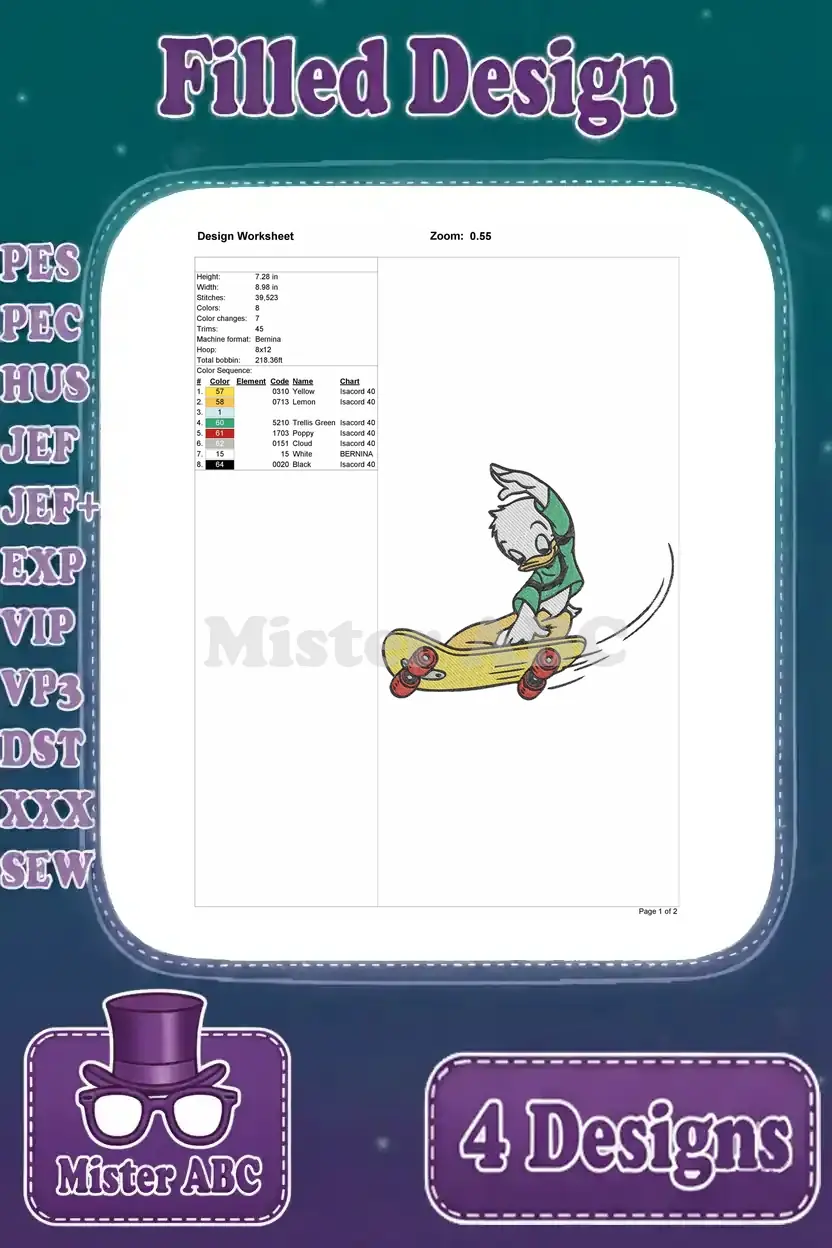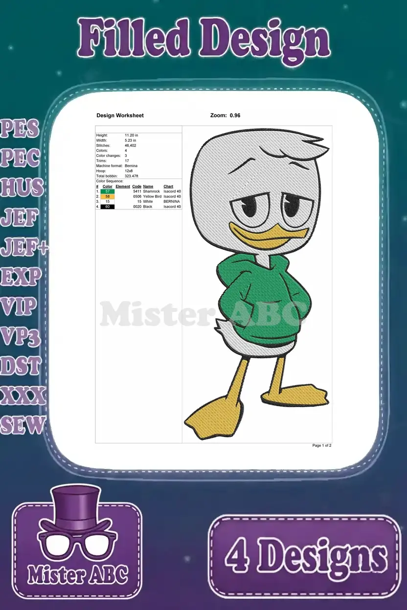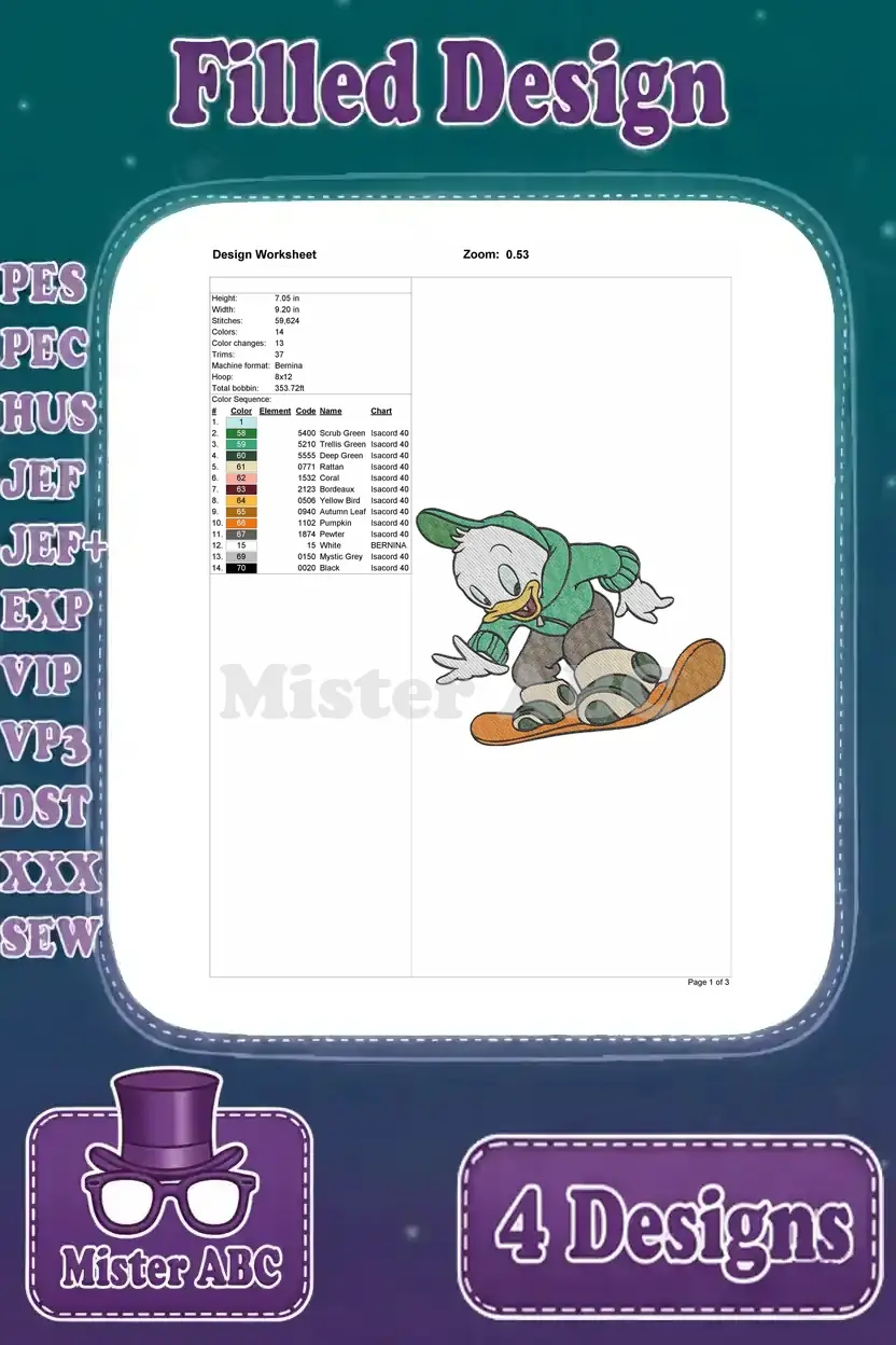 Disney Ducktales Louie Duck Green Outfit Walking Snowboarding Sad Flying Plane Bundle – Filled Embroidery Design