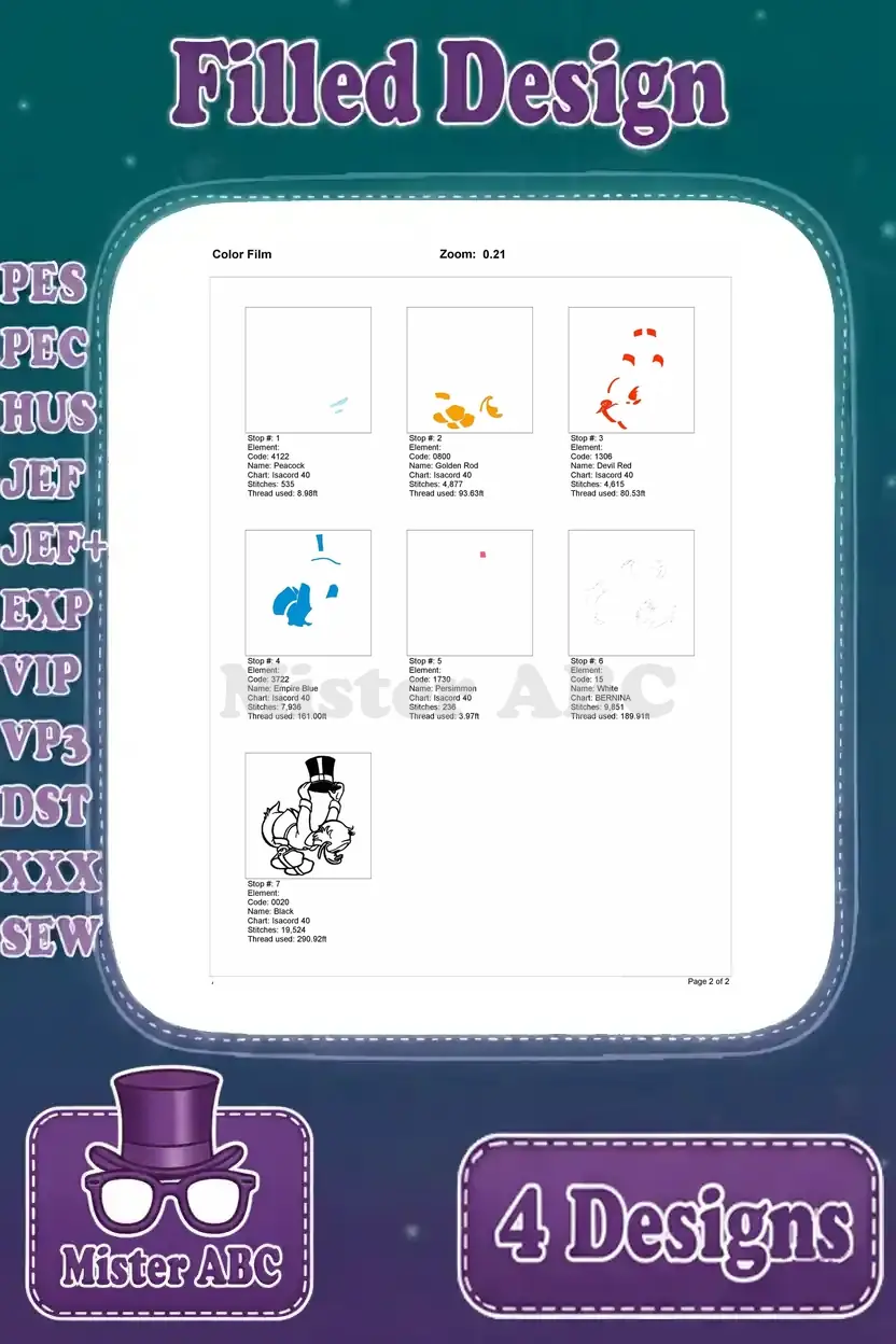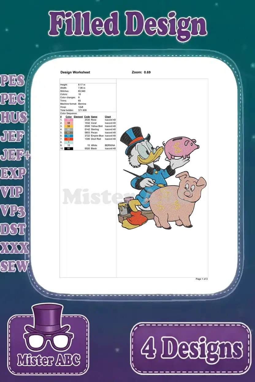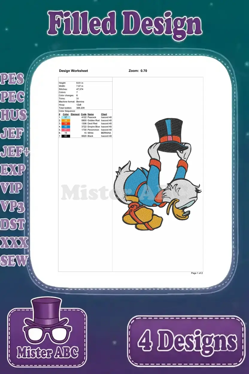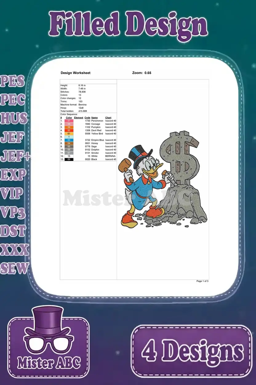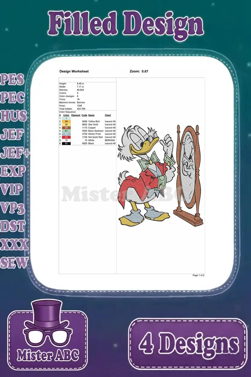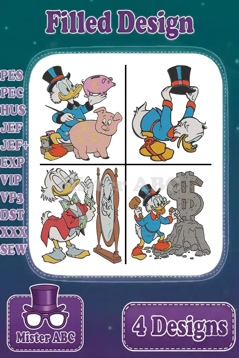 Dive into a world of wealth and humor with this Scrooge McDuck embroidery bundle! Four filled designs capture his iconic pursuit of riches, perfect for fans.