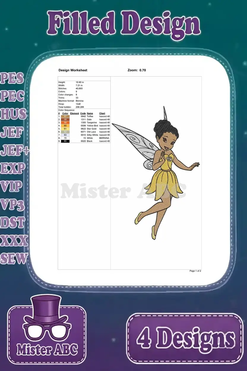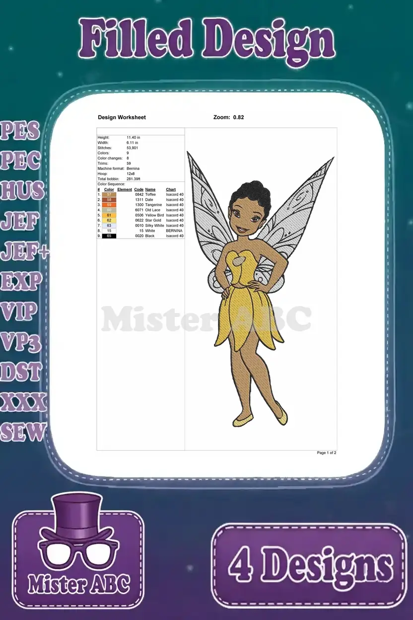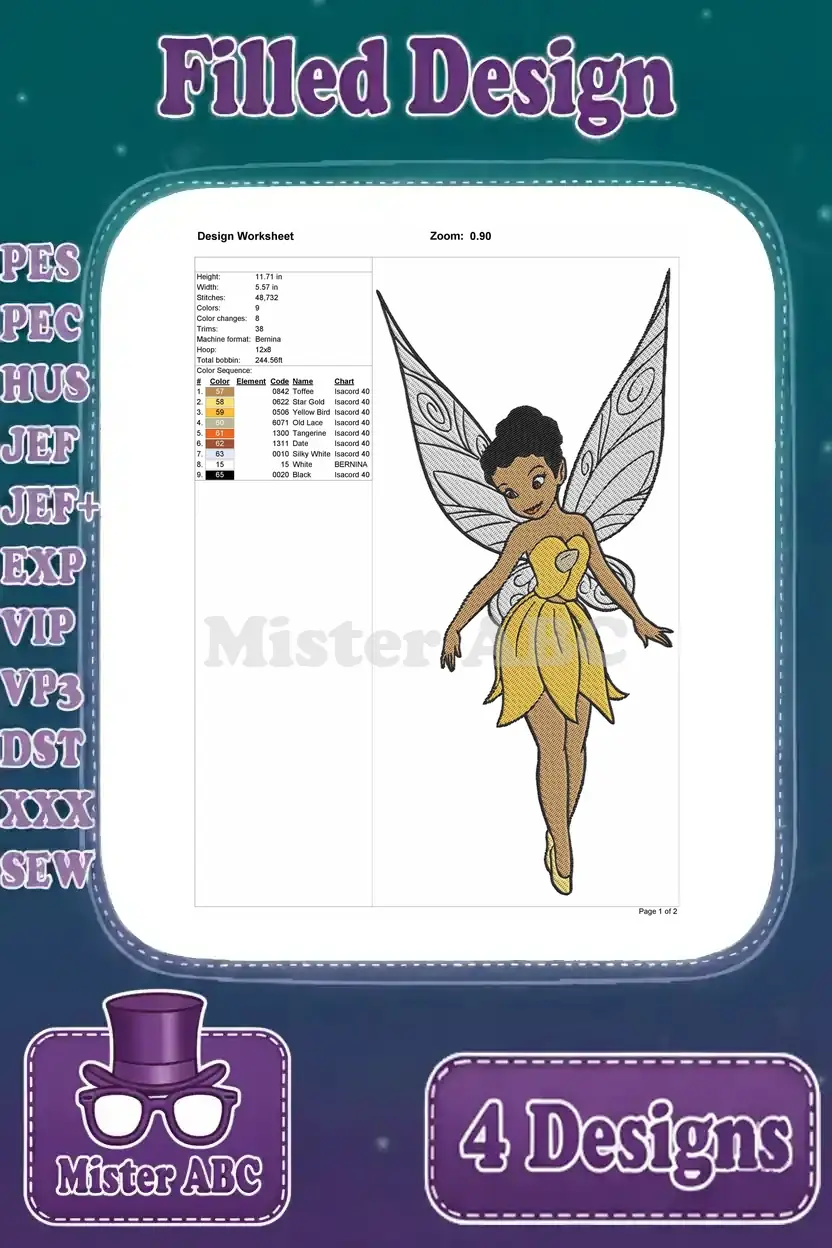 Disney Fairies Iridessa Light Talent Fairy Yellow Dress Various Bright Poses – Filled Embroidery Design