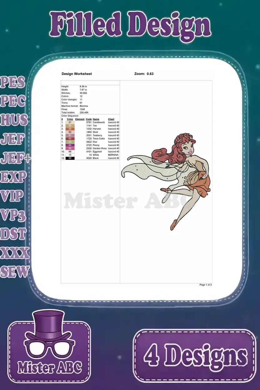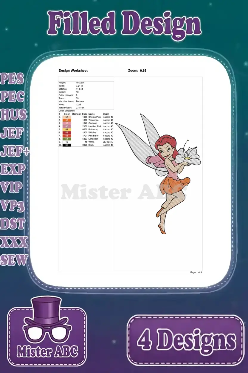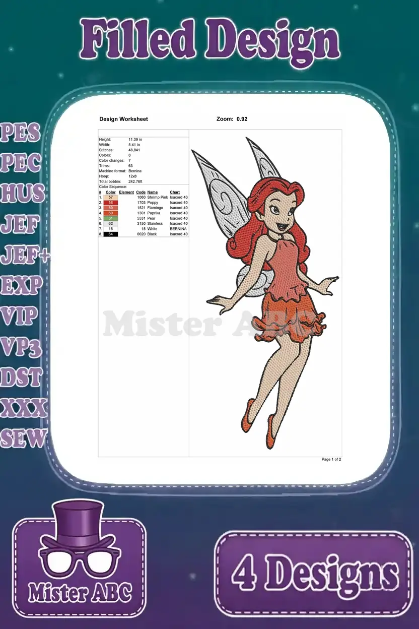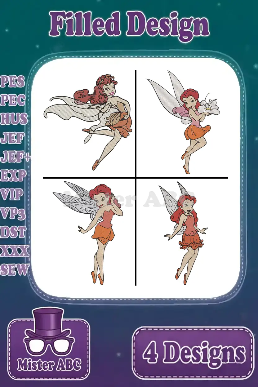 Disney Fairies Rosetta Garden Fairy With Flowing Hair And Various Red Outfits – Filled Embroidery Design