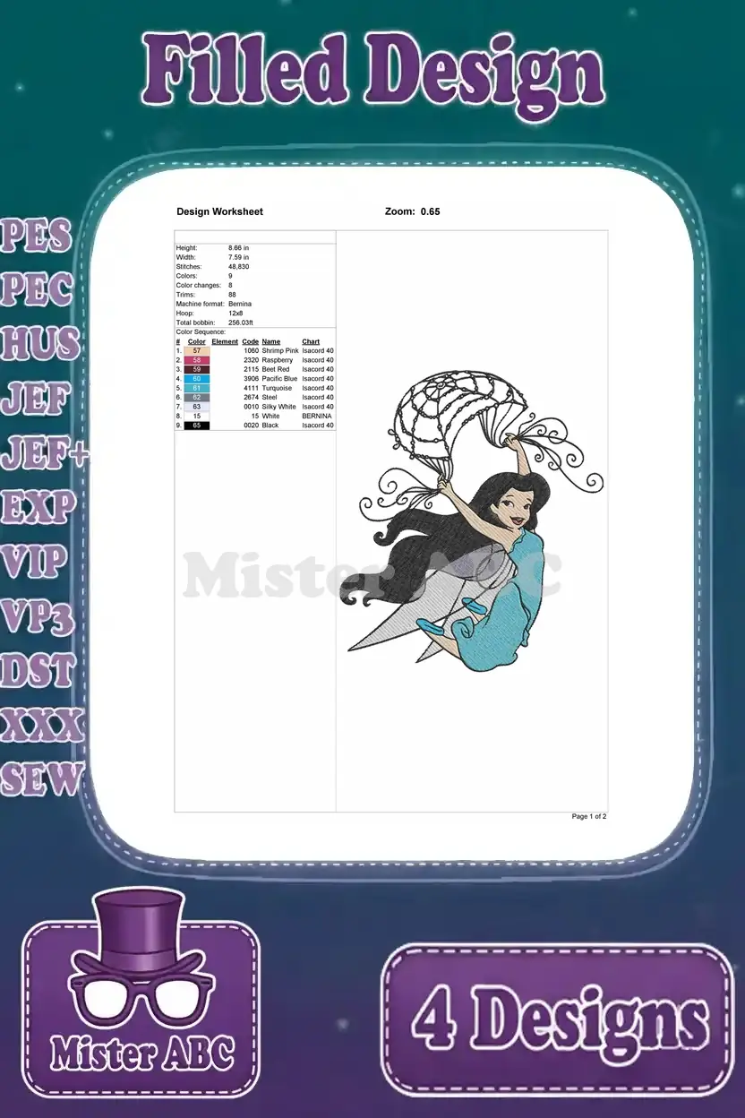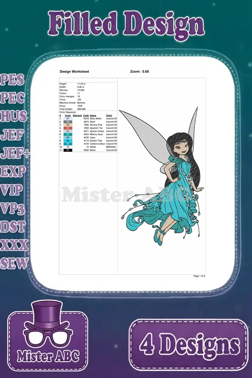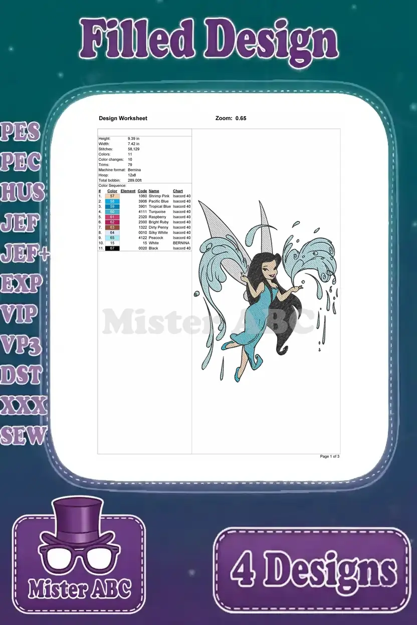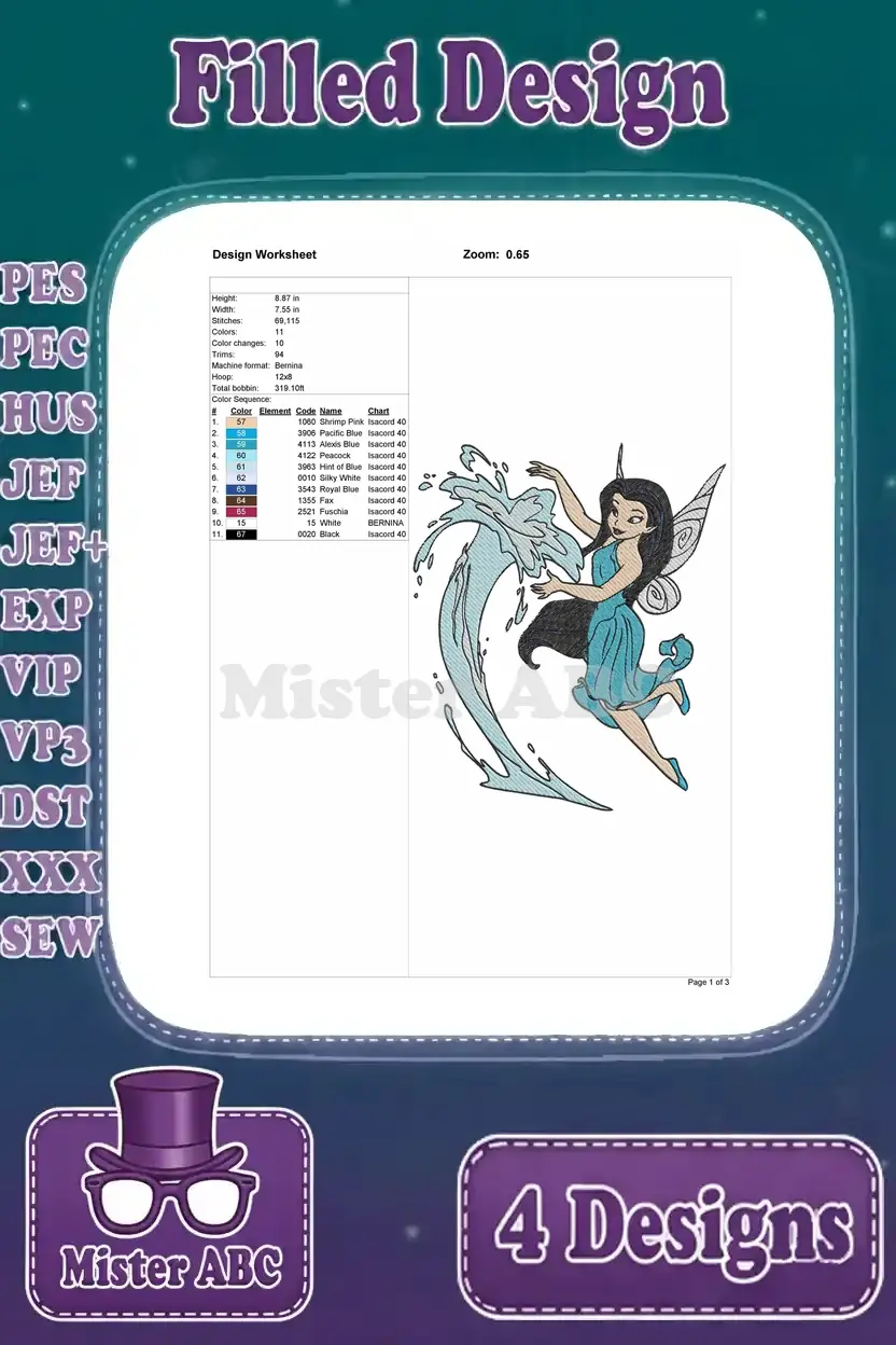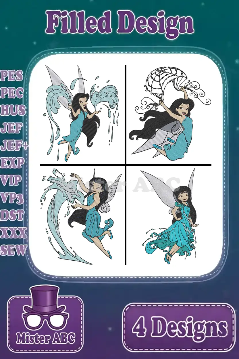 Disney Fairies Silvermist Water Fairy Interacting With Water Splashes And Waves – Filled Embroidery Design