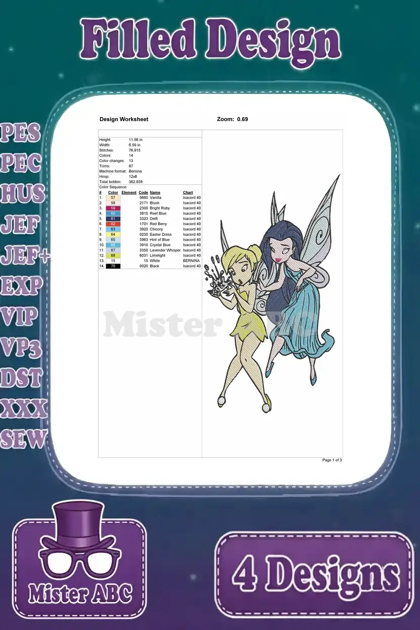 Disney Fairies Tinker Bell Fawn Rosetta Silvermist Vidia Winter Fairy Periwinkle – Filled Embroidery Design