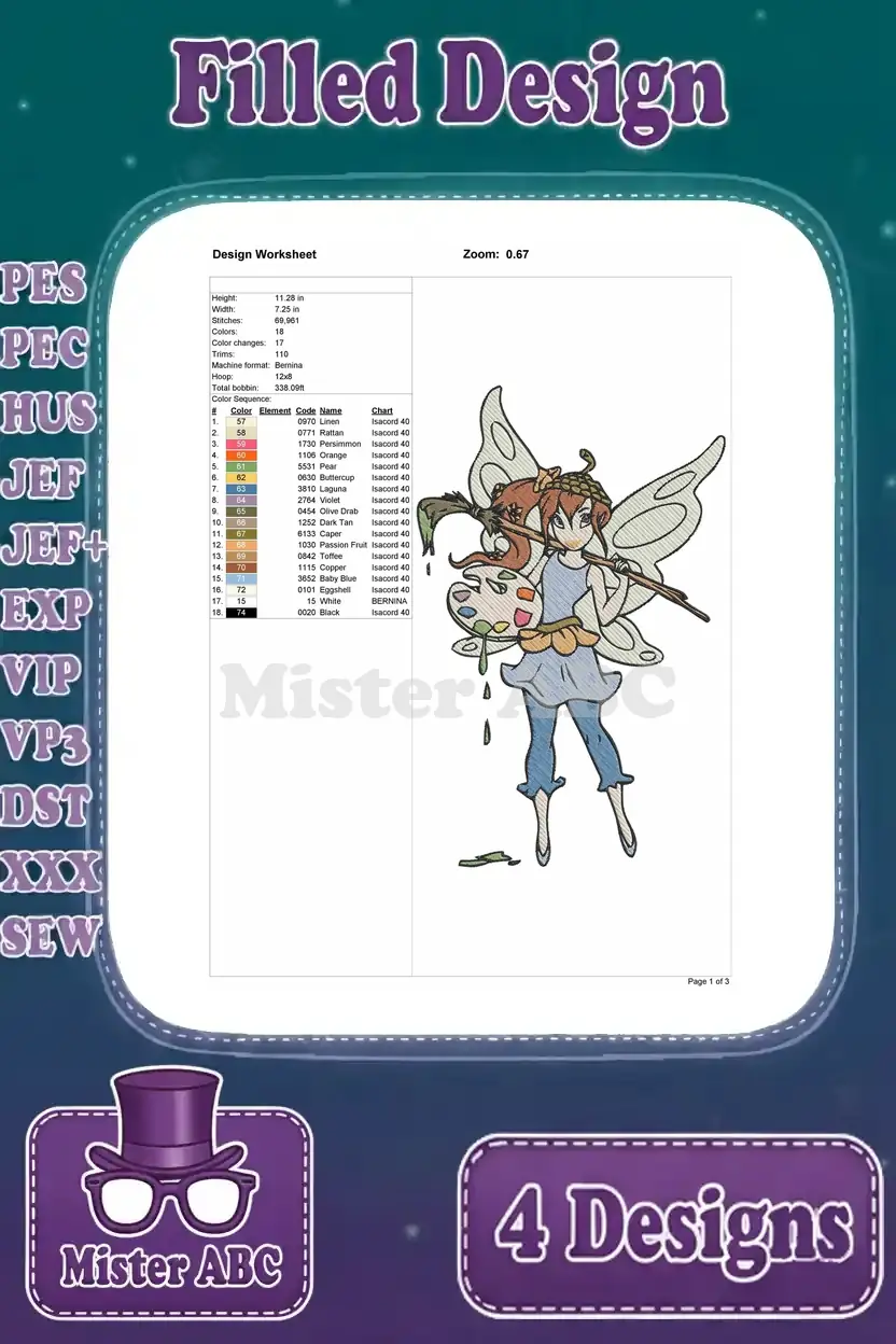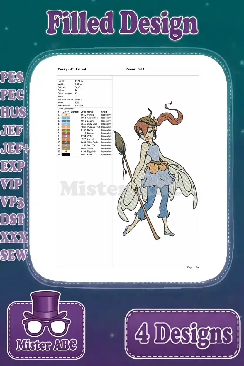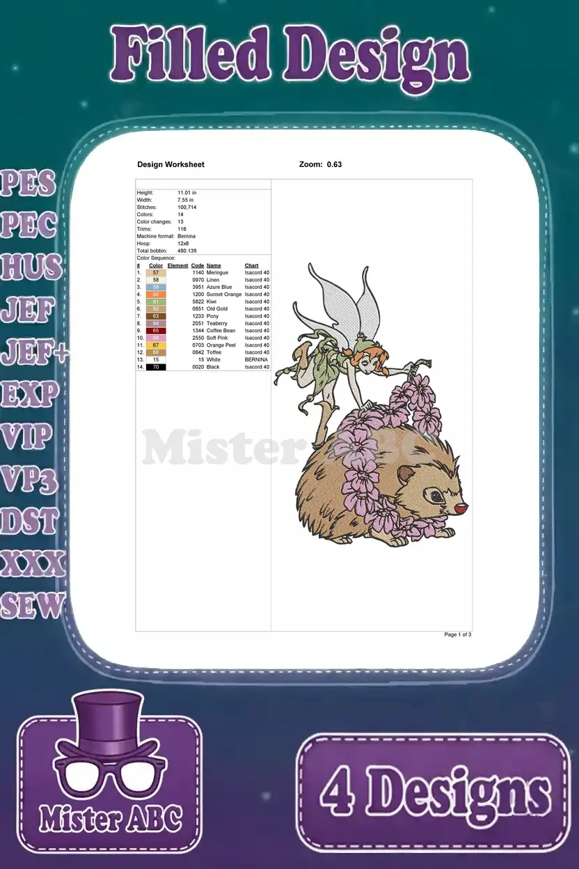 Delightful bundle of four filled embroidery designs featuring enchanting fairies and a charming hedgehog. Perfect for fantasy-themed projects.