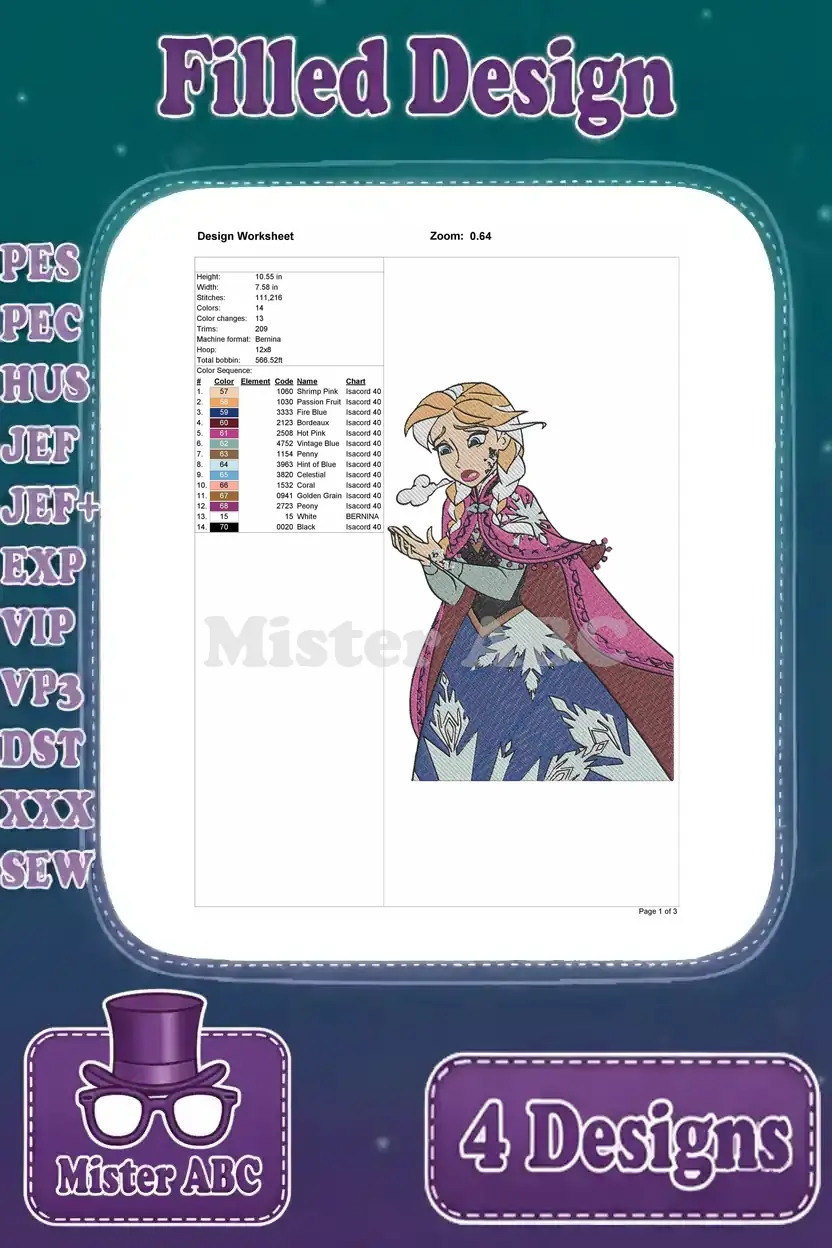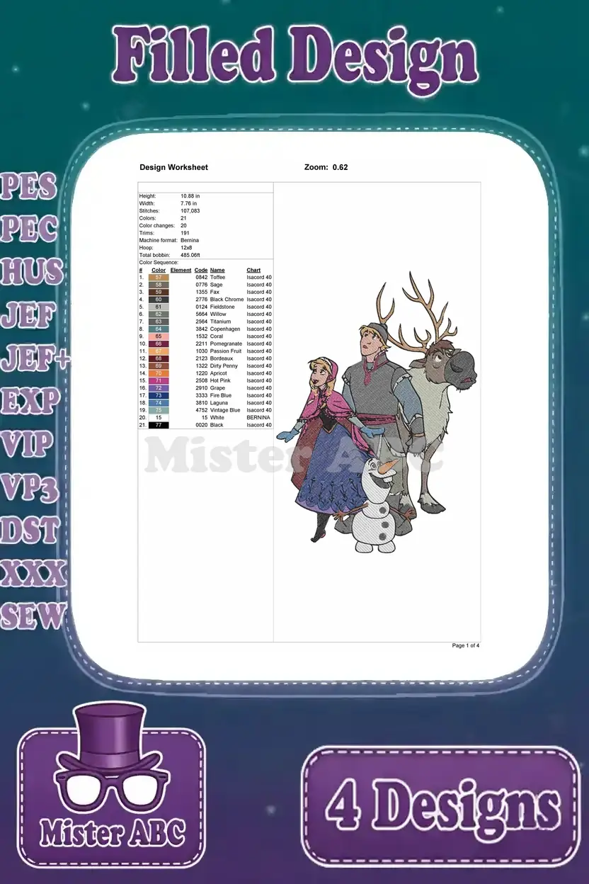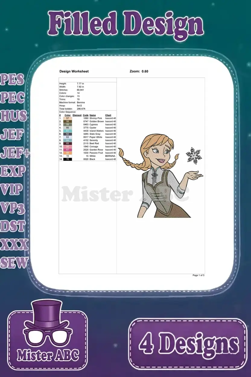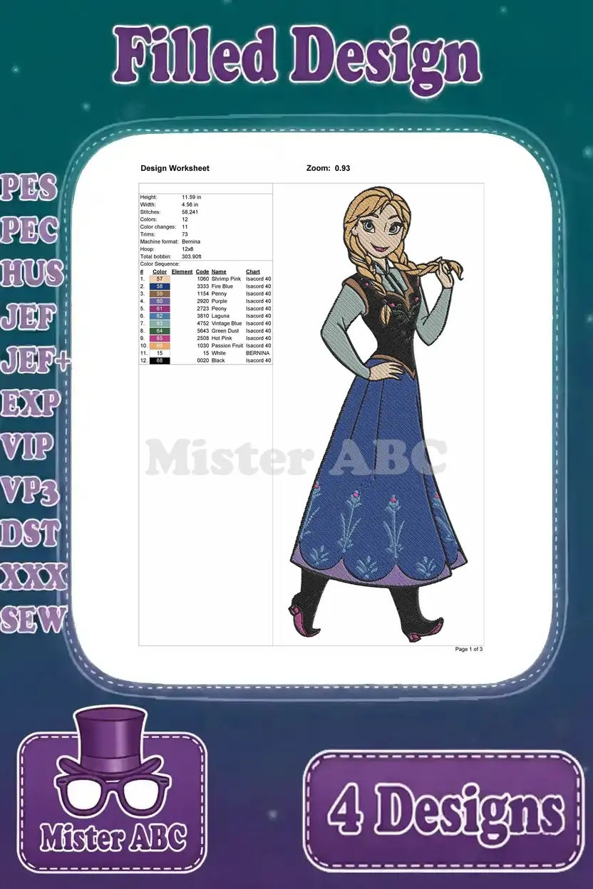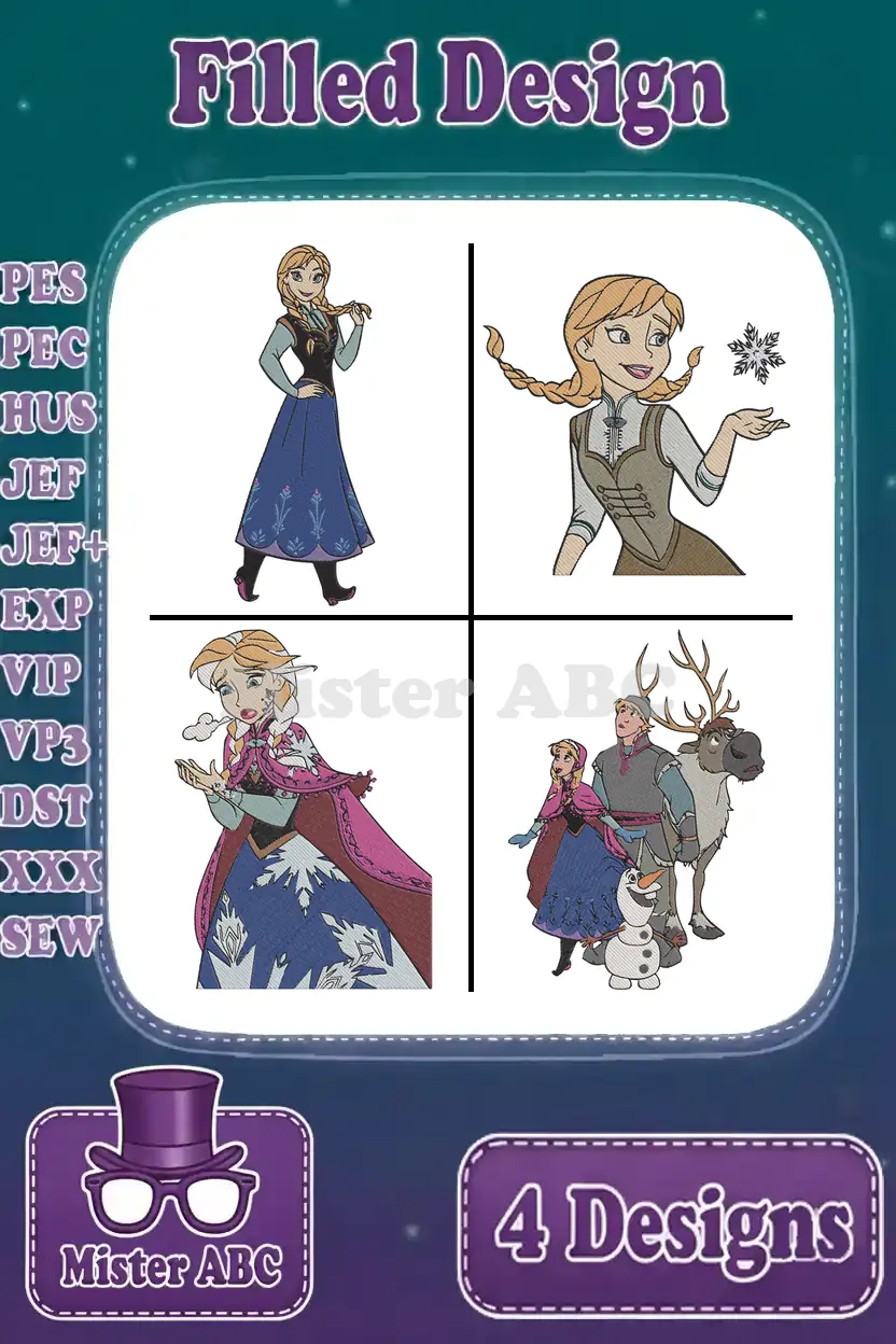 Disney Frozen Anna Winter Dress With Snowflake Kristoff Sven Friends Group Designs – Filled Embroidery Design
