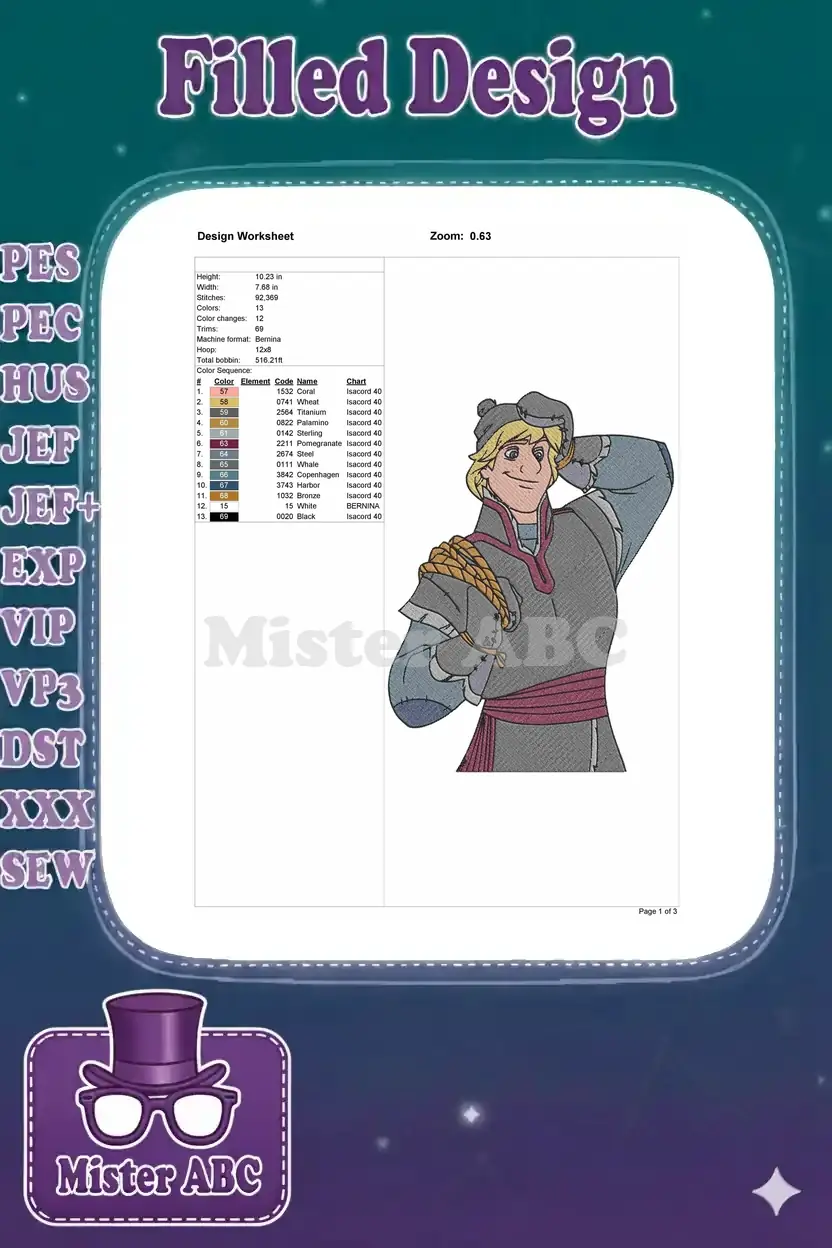 Disney Frozen Kristoff character winter outfit adventurous man embroidery designs