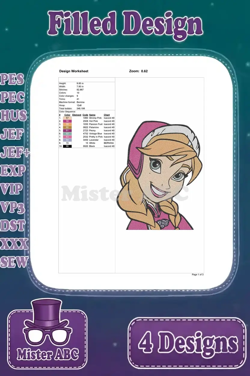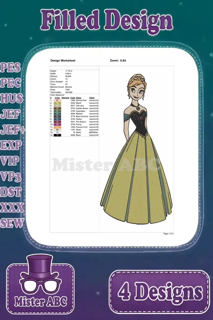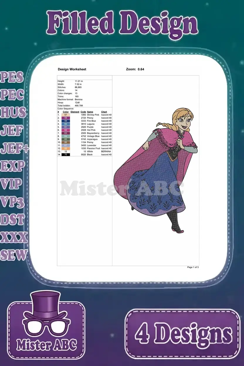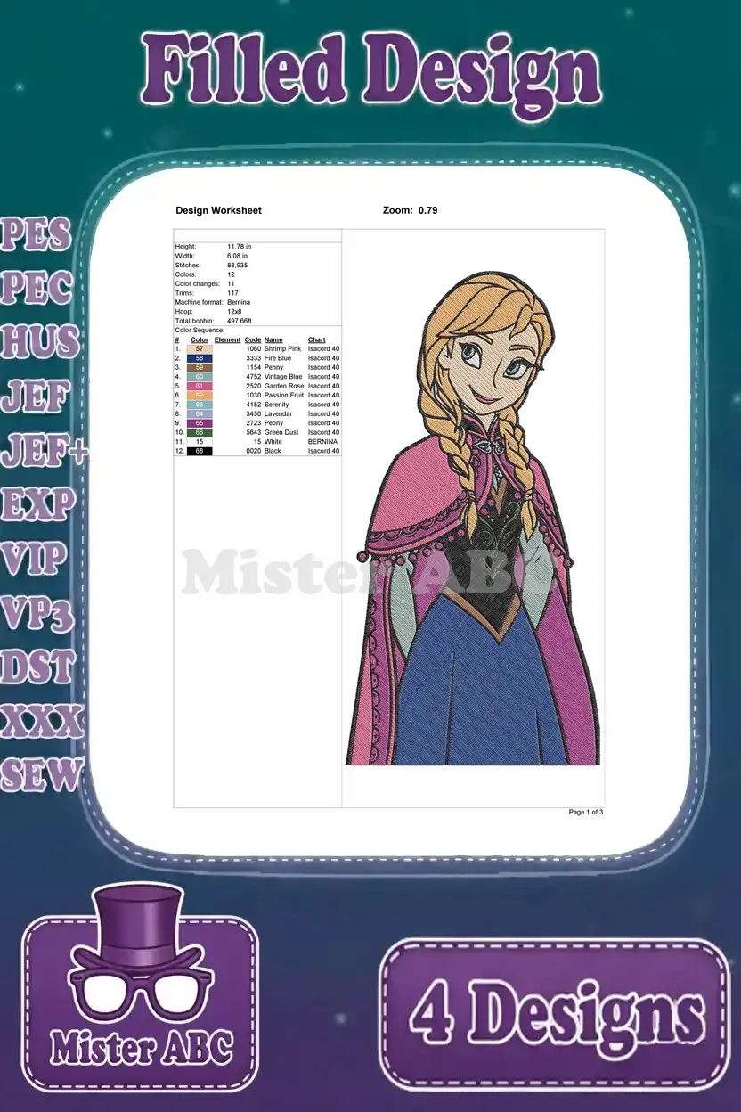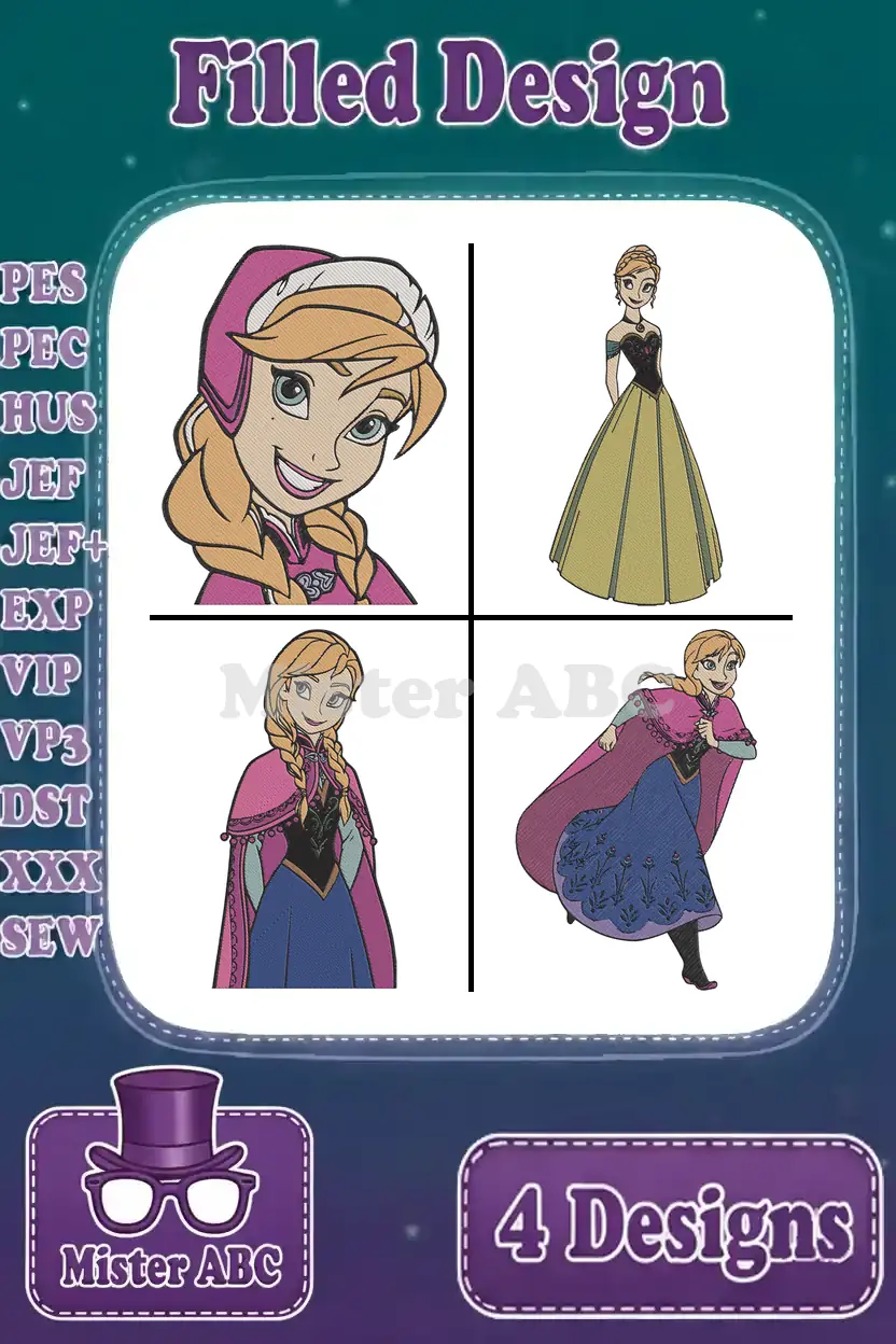 Disney Frozen Princess Anna Winter Cloak Green Dress Various Poses Close Up – Filled Embroidery Design
