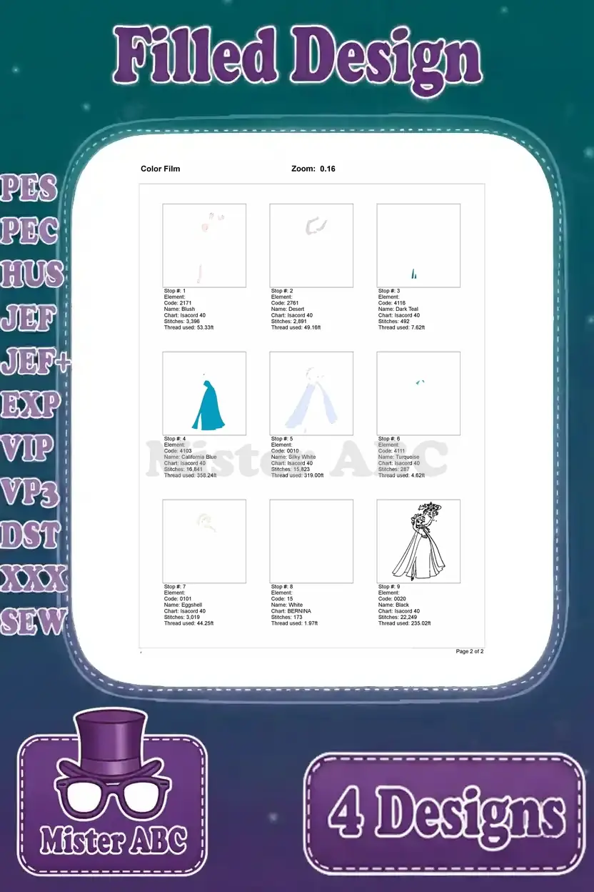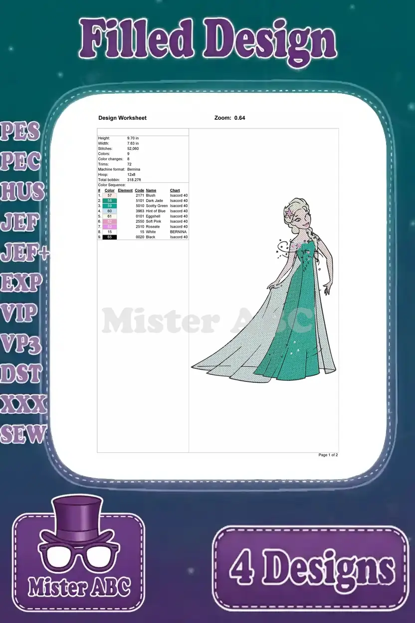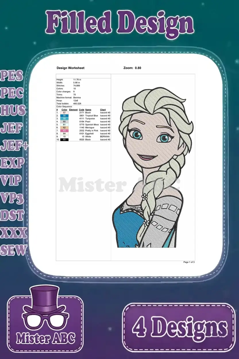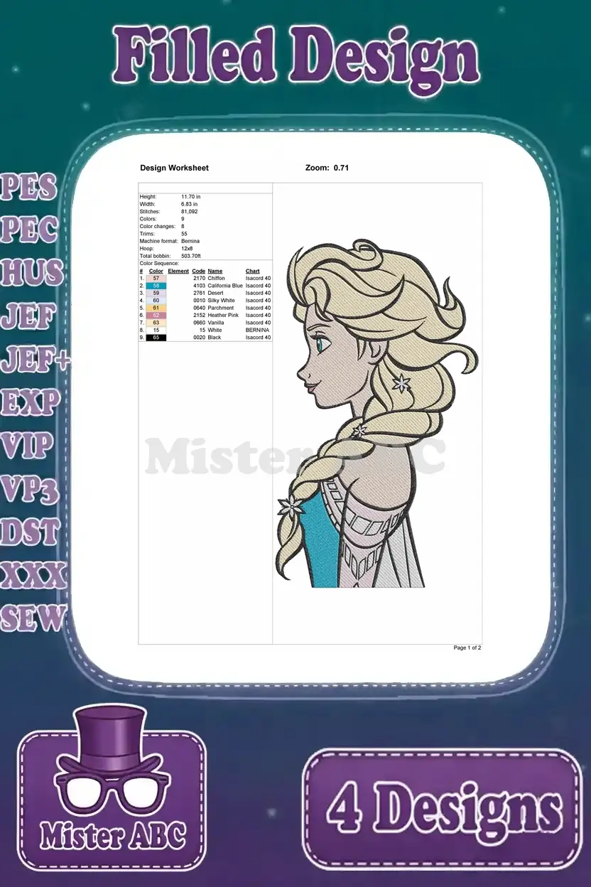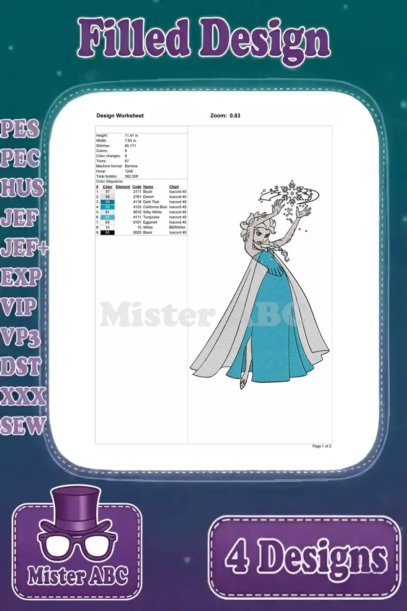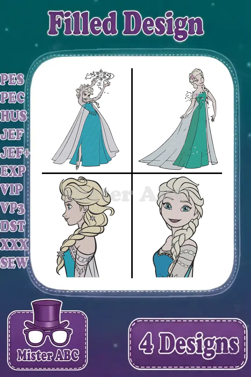 Magical Elsa embroidery designs bundle! Four enchanting filled stitch patterns for all your crafting projects, perfect for fans.