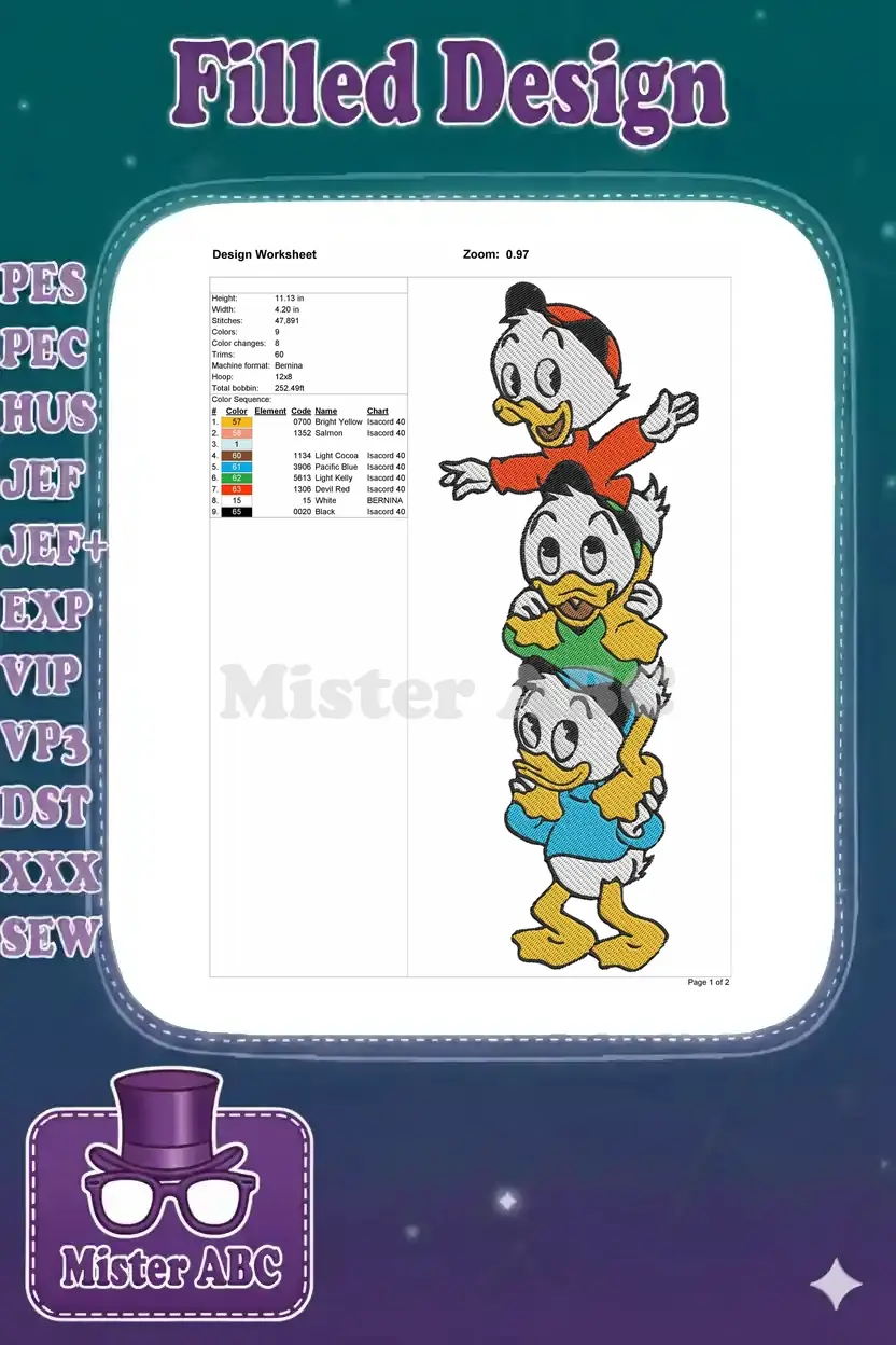 Disney Huey Dewey Louie ducklings stacked funny cartoon embroidery designs