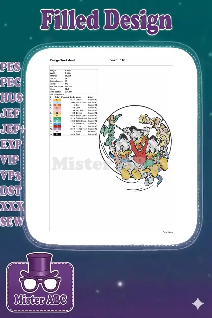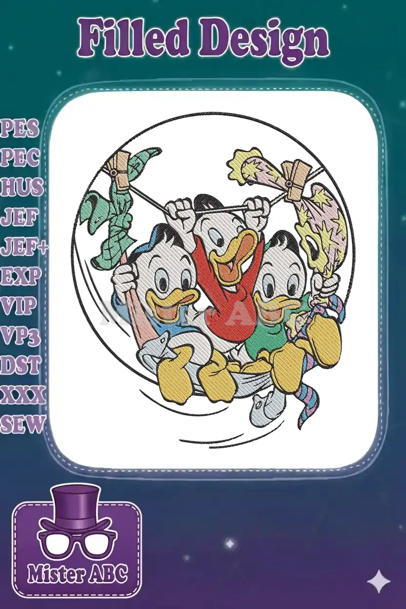 Bring playful joy to your projects with this delightful embroidery design featuring Huey, Dewey, and Louie in a fun laundry scene!