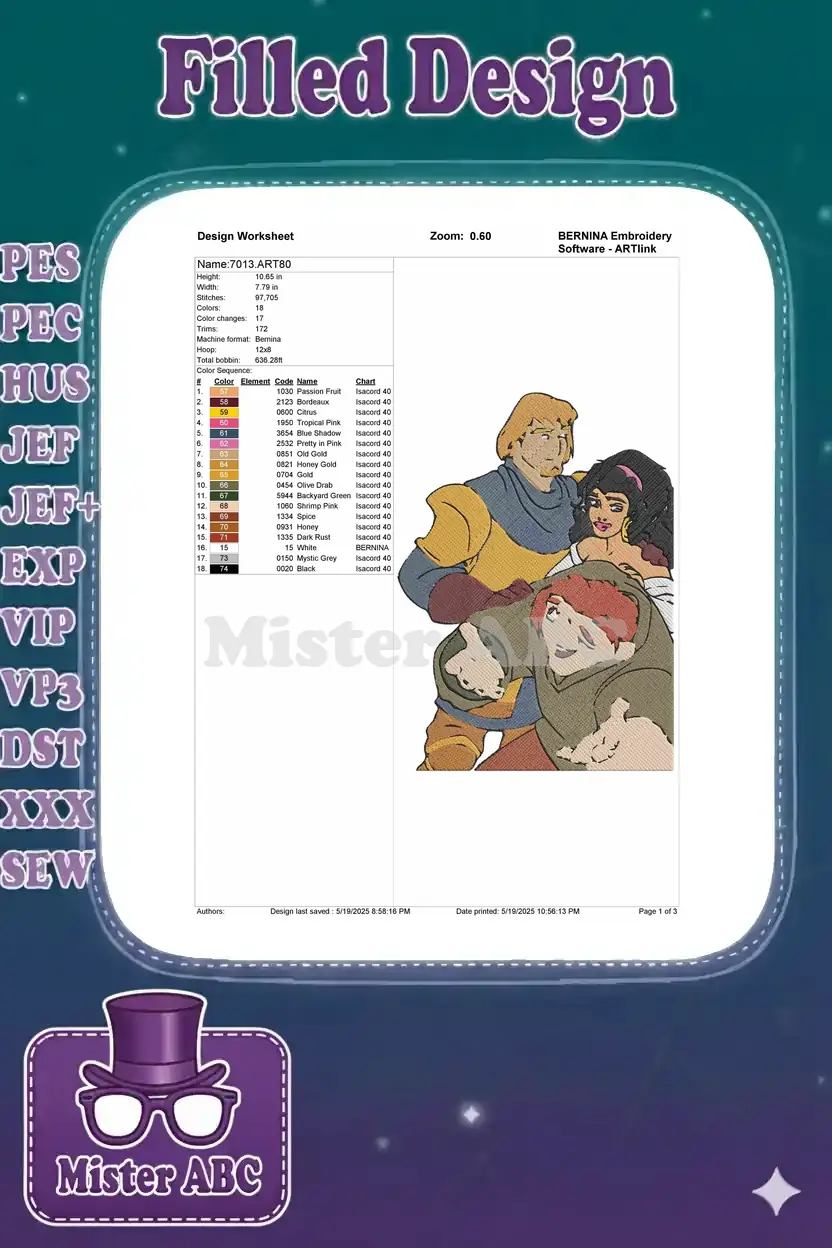 Disney Hunchback Notre Dame Phoebus Esmeralda Quasimodo Character embroidery designs