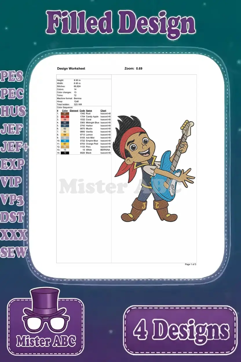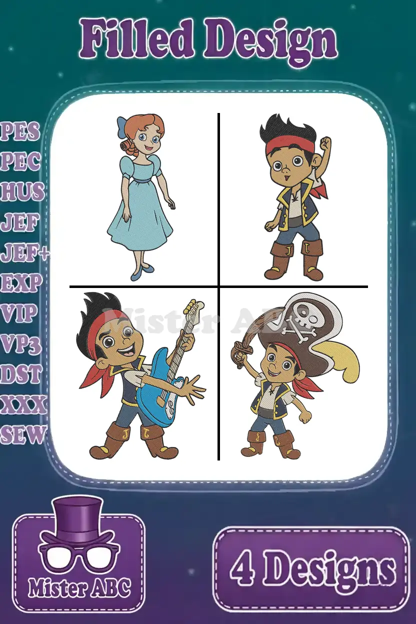 Disney Jake Never Land Pirates With Guitar Wendy Peter Pan Captain Hook – Filled Embroidery Design