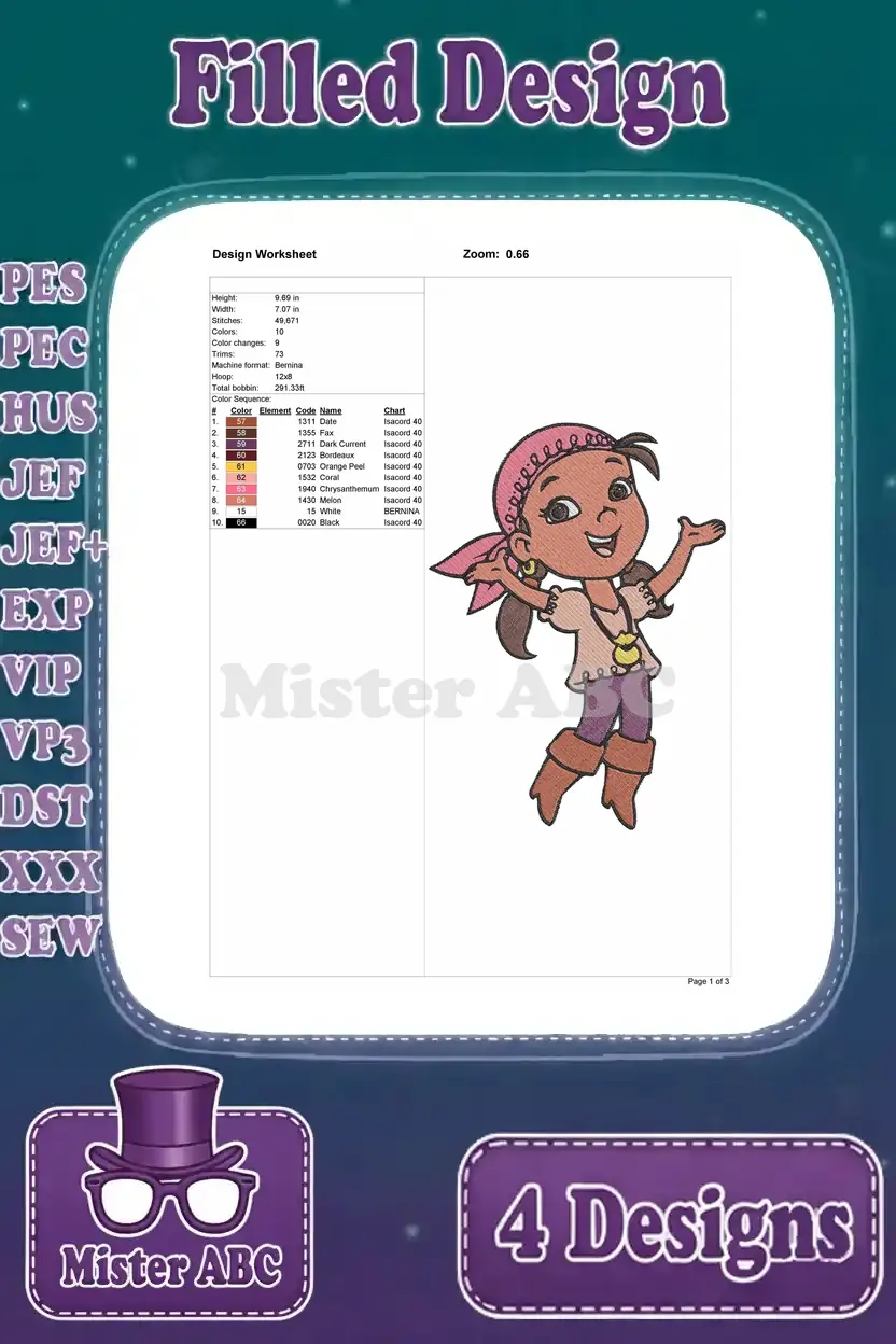 Disney Jake Never Land Pirates Izzy On Barrel Cubby Sleeping Genie Pirate Girls – Filled Embroidery Design