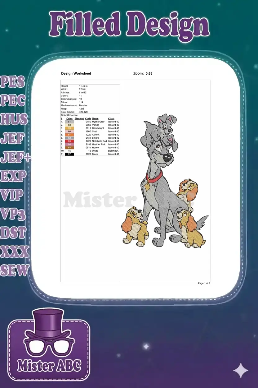 Disney Lady Tramp and Puppies Family Embroidery Designs