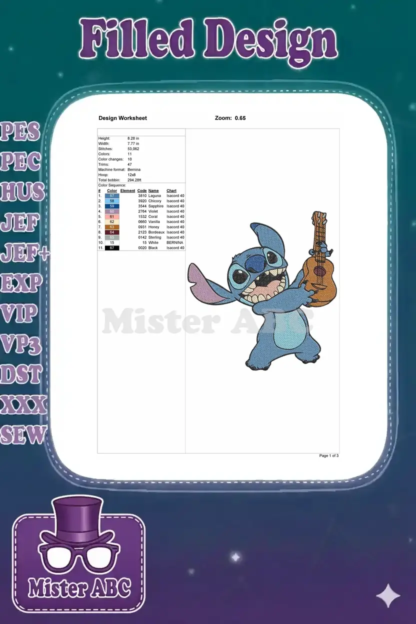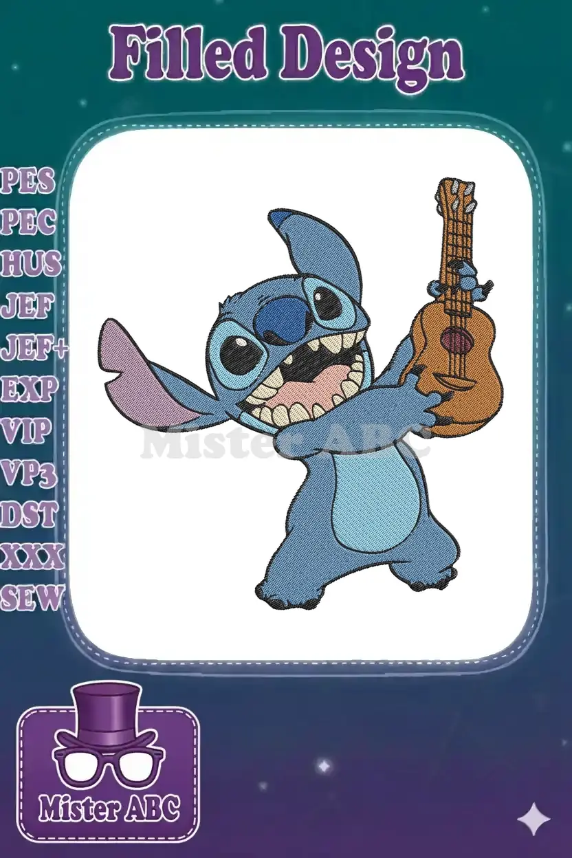 Disney Lilo Stitch alien playing ukulele music embroidery designs