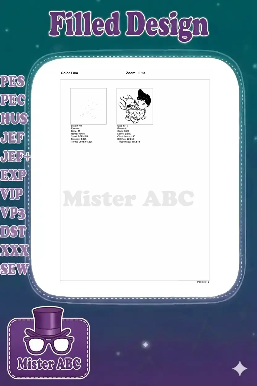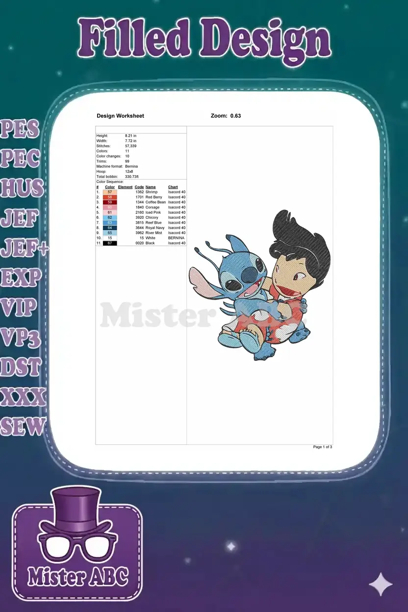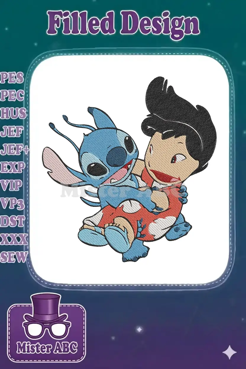 An adorable embroidery design featuring Lilo and Stitch in a heartwarming hug. Perfect for fans of the iconic Disney duo, bringing joy to any project.
