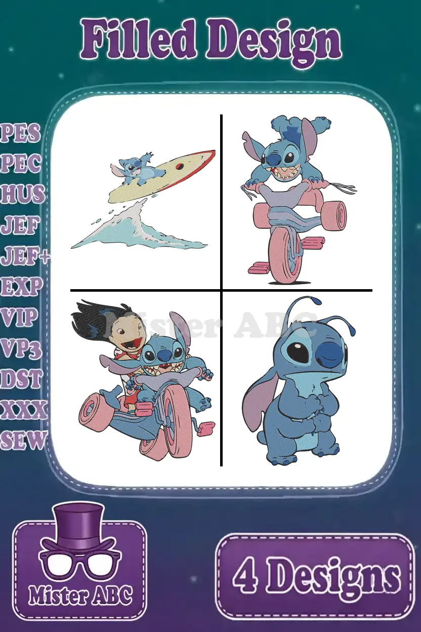 Disney Lilo Stitch Surfing Pink Car Ride Stitch Alien Form Cute And Fluffy Set – Filled Embroidery Design