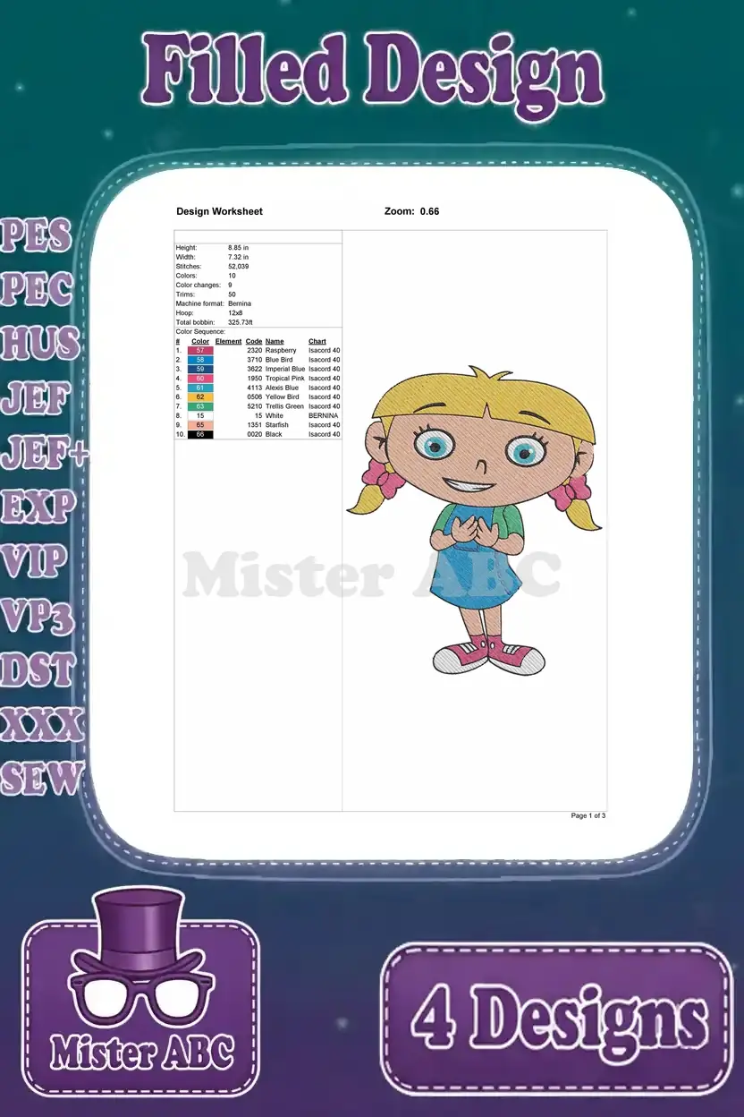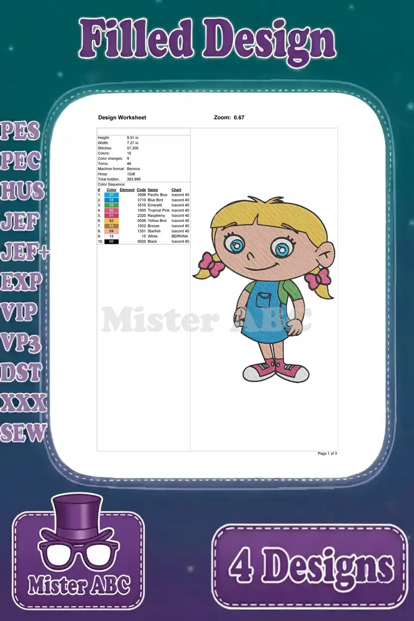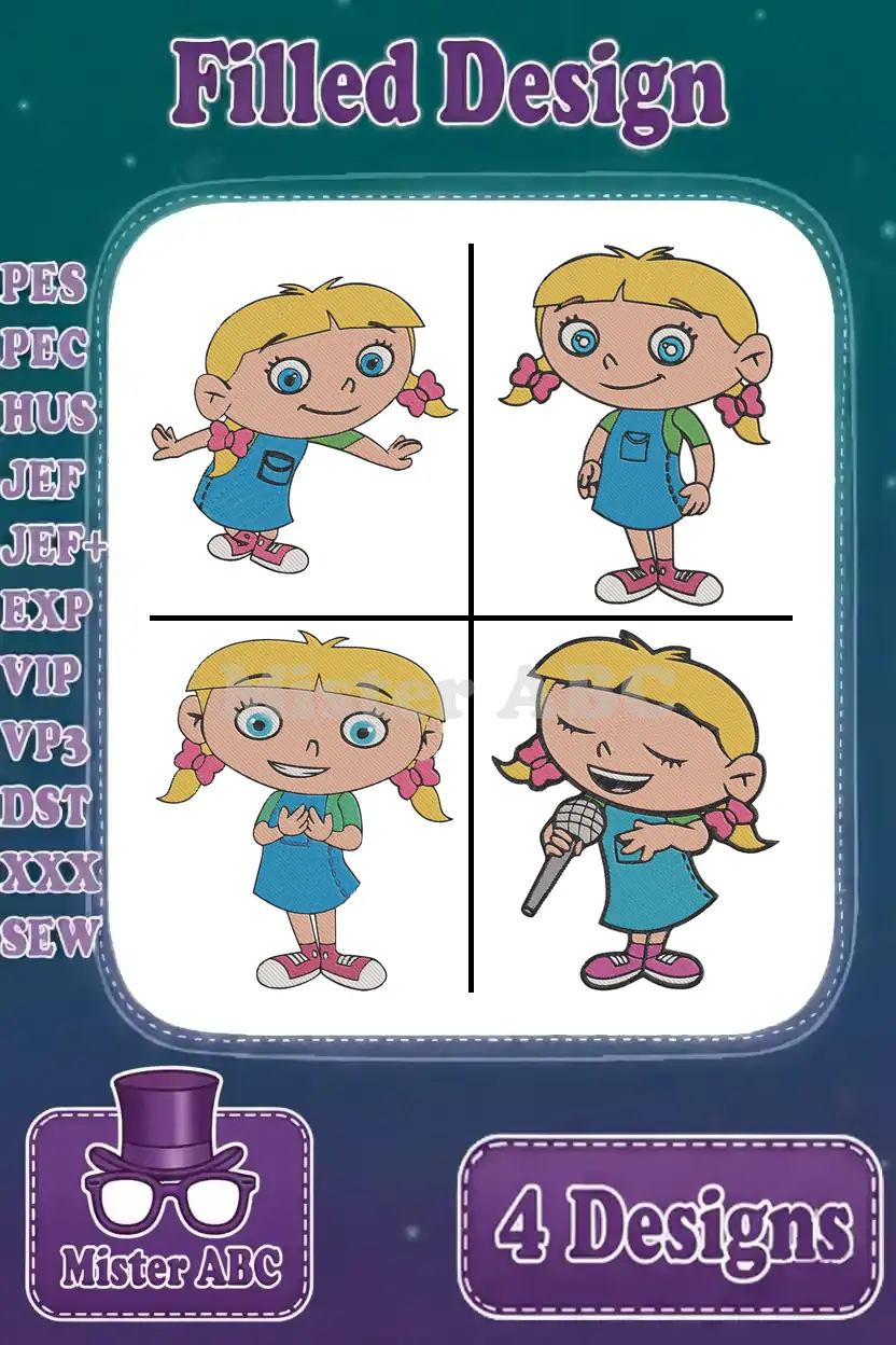 Disney Little Einsteins Annie Singer Blonde Girl Various Standing Poses Collection – Filled Embroidery Design