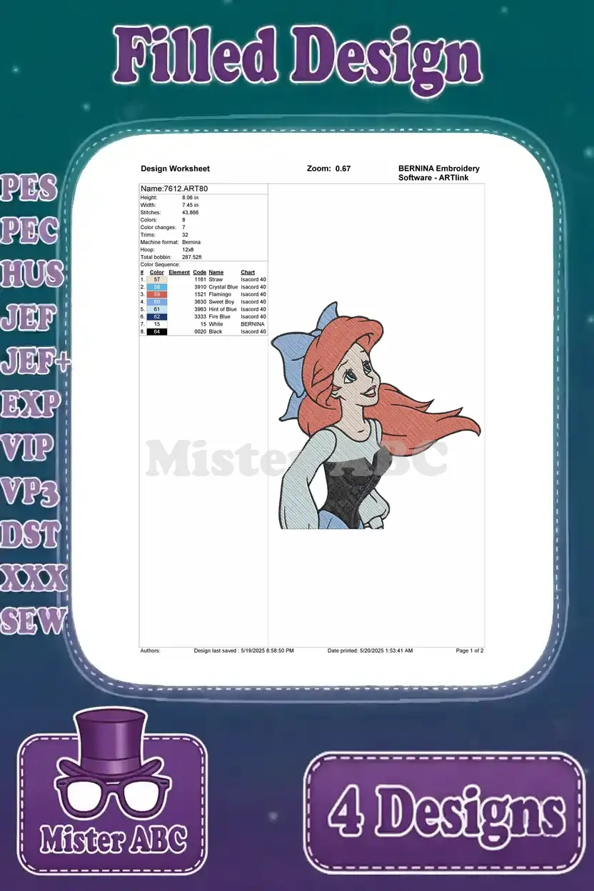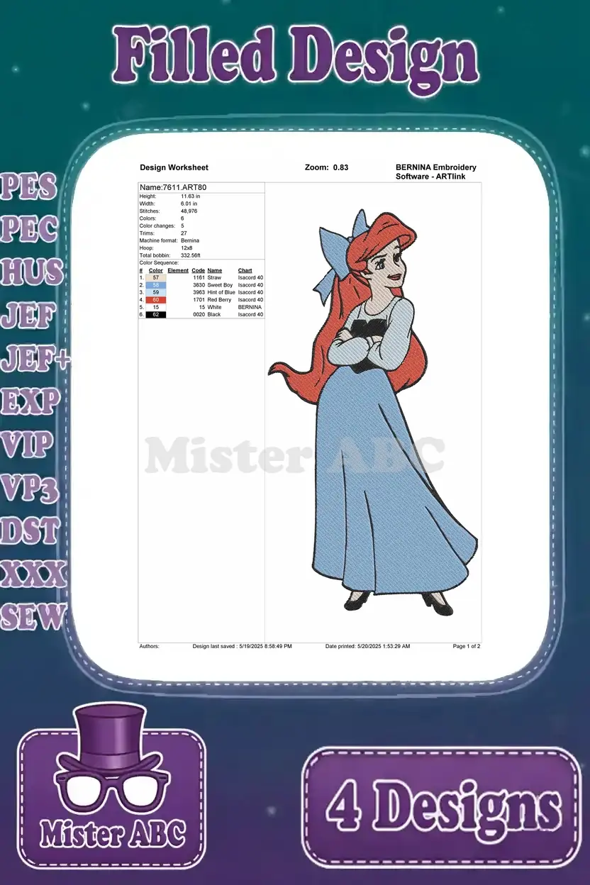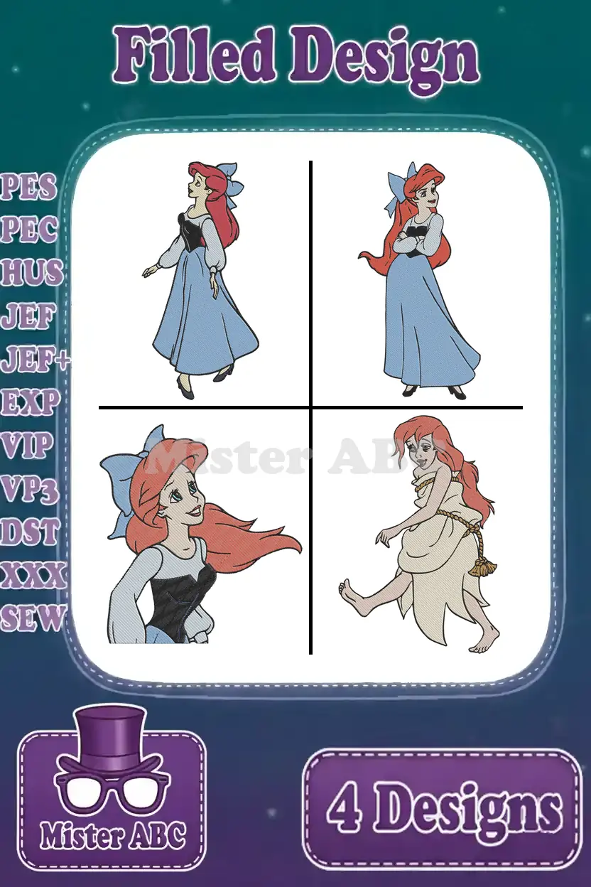 Disney Little Mermaid Ariel Blue Town Dress Close Up Portrait Walking Human – Filled Embroidery Design