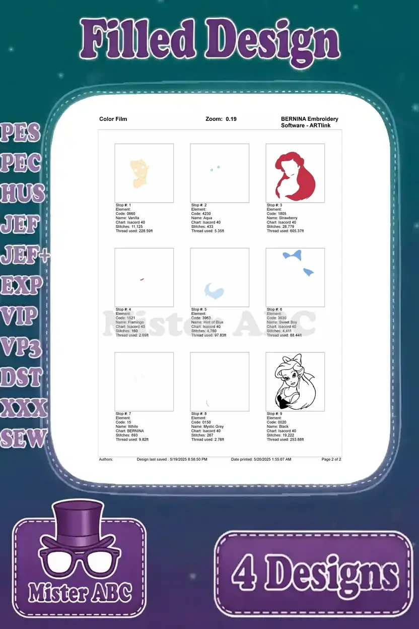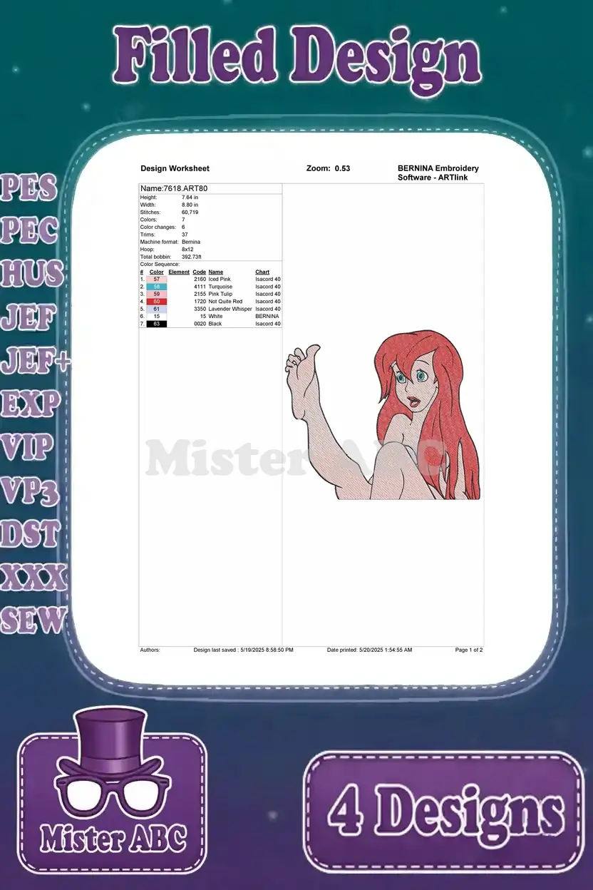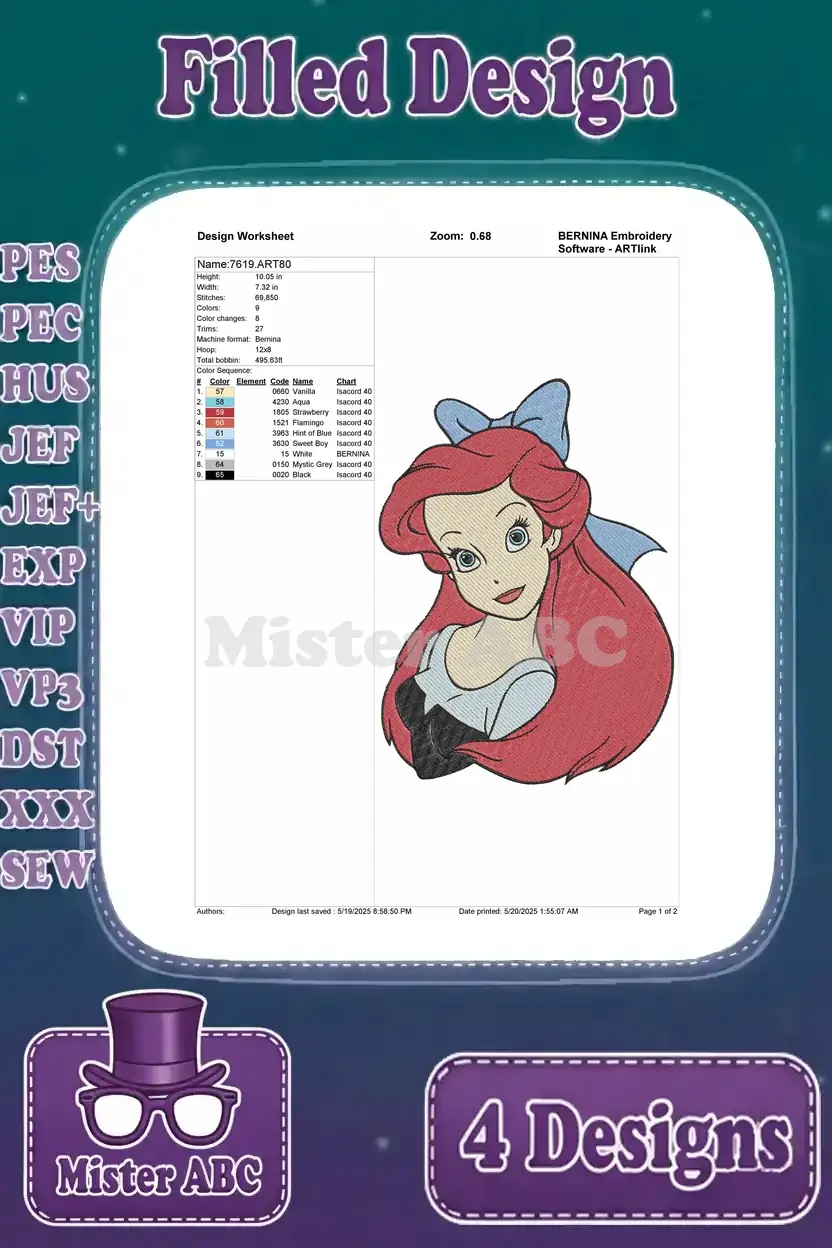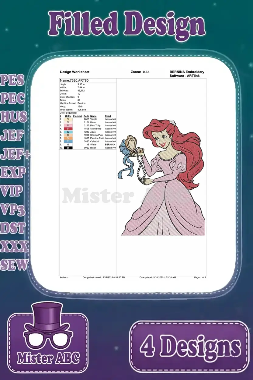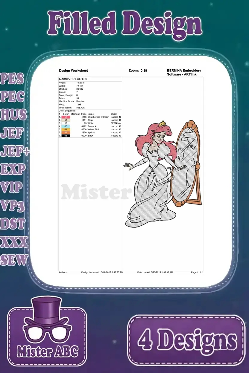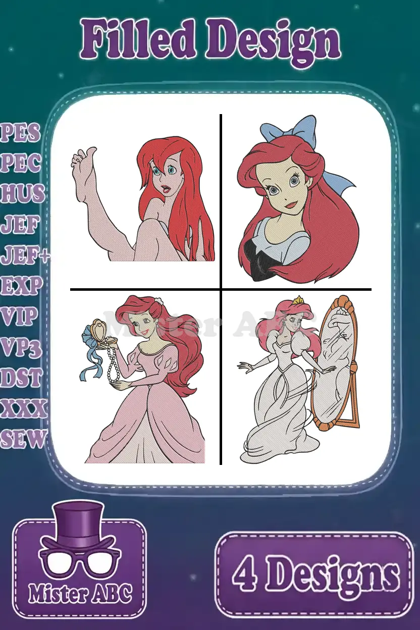 Disney Little Mermaid Ariel Human Arm Pink Dress Wedding Gown Mirror Set – Filled Embroidery Design