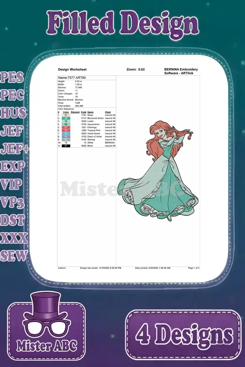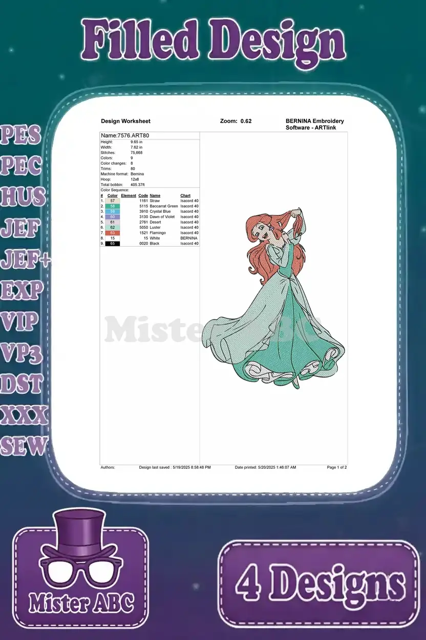 Disney Little Mermaid Ariel Green Dress Human Princess Elegant Poses Walking – Filled Embroidery Design
