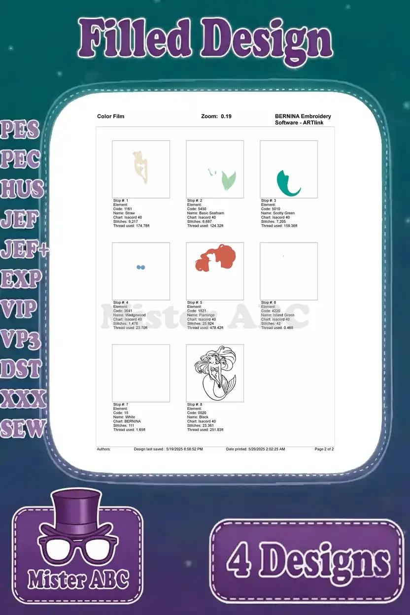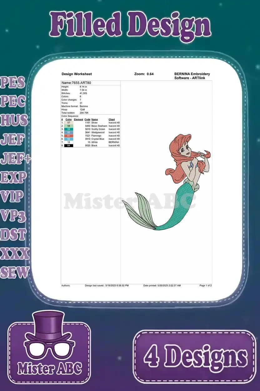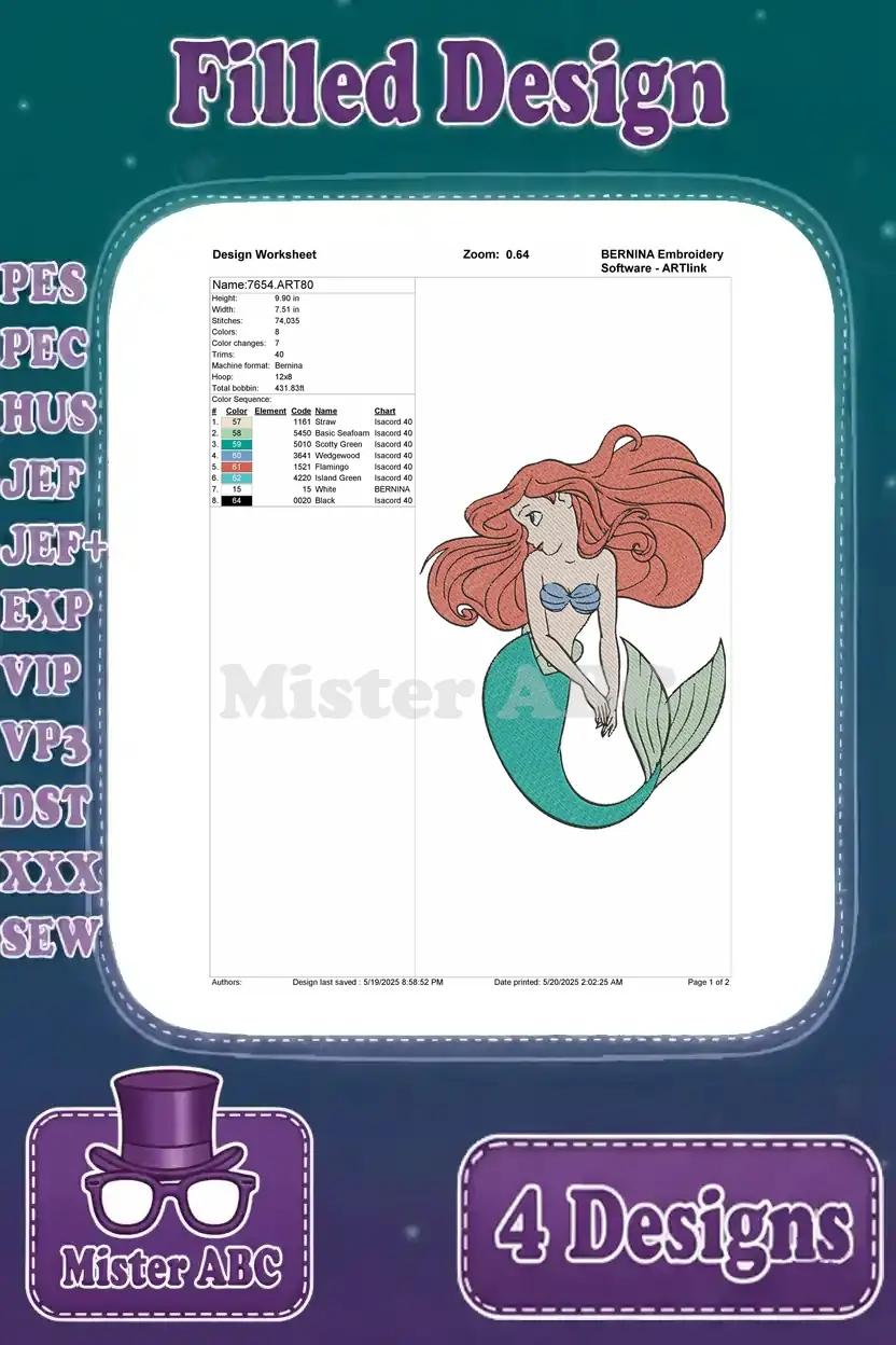 Disney Little Mermaid Ariel Mermaid Form Various Swimming And Posing Graceful – Filled Embroidery Design