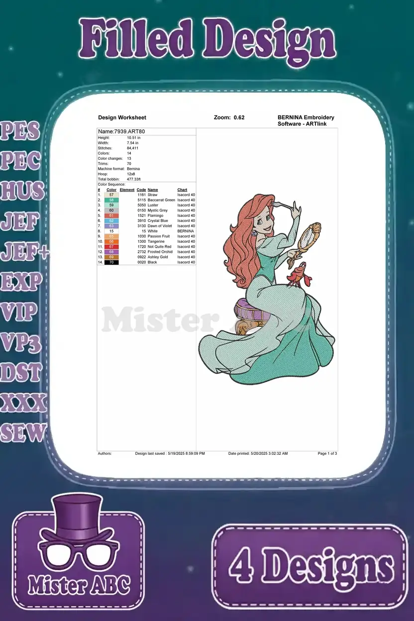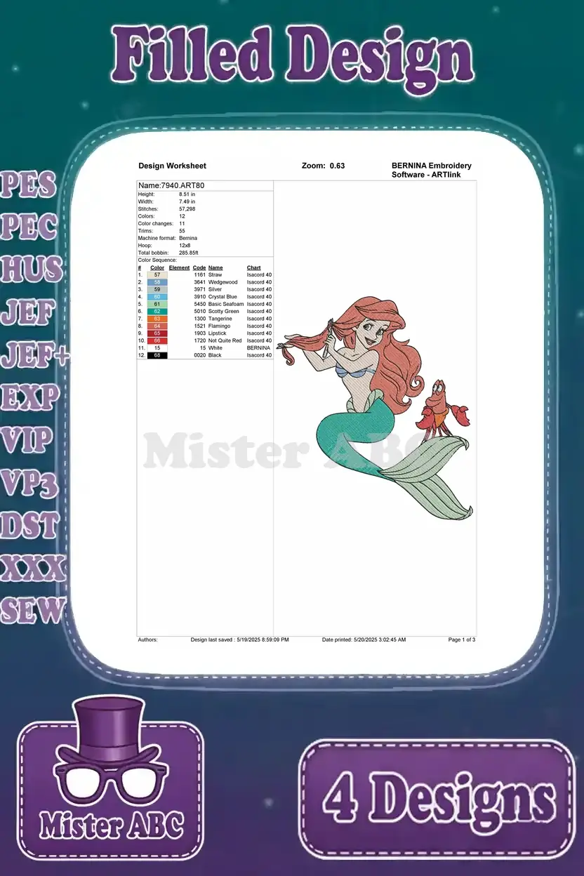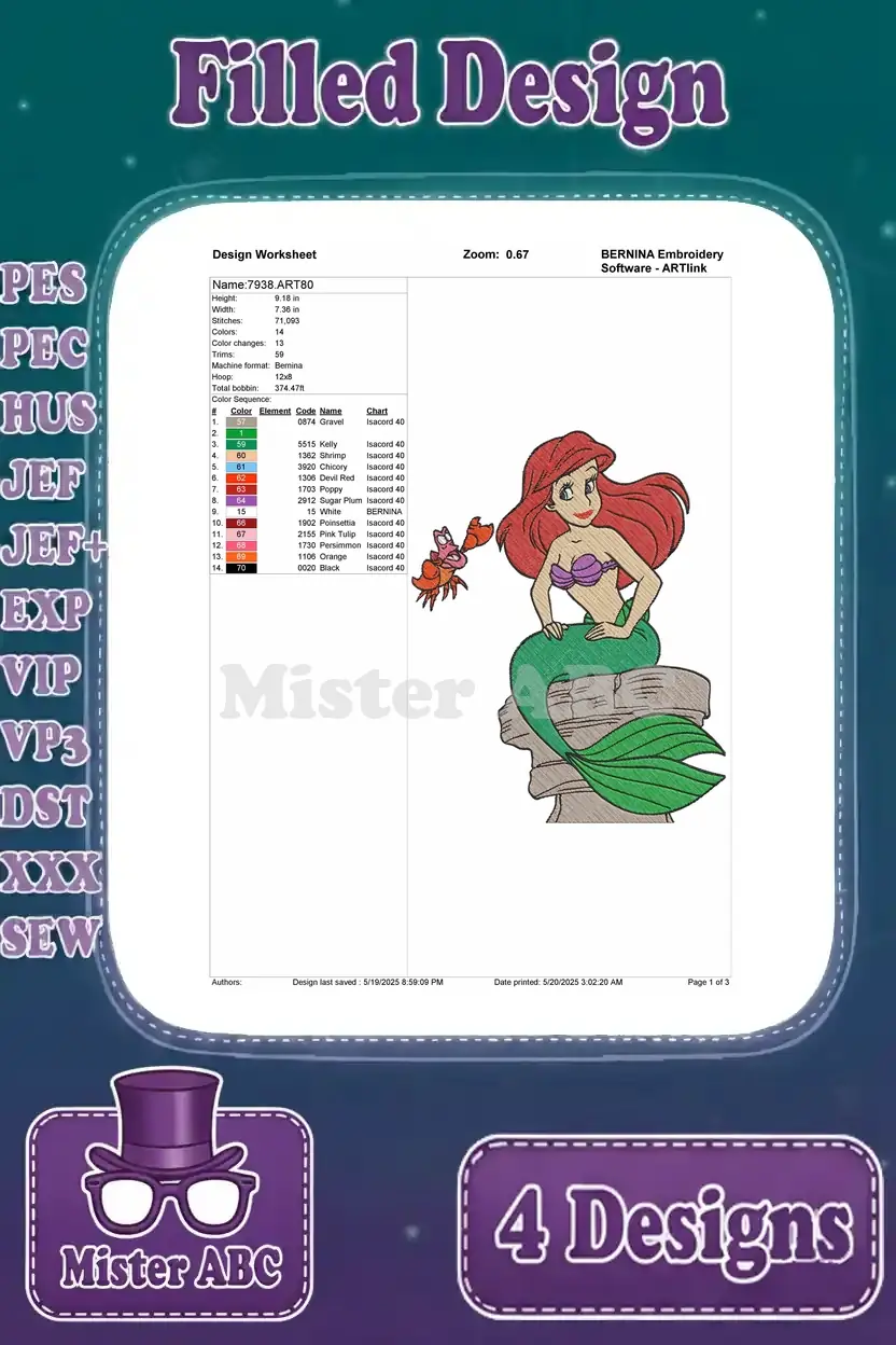 Disney Little Mermaid Ariel With Sebastian Crab On Rock Green Dress Mermaid Form Bundle – Filled Embroidery Design