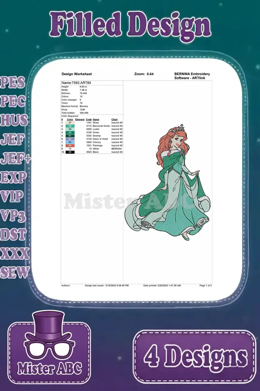 Disney Little Mermaid Ariel Pink And Green Dresses Human Princess Outfits – Filled Embroidery Design