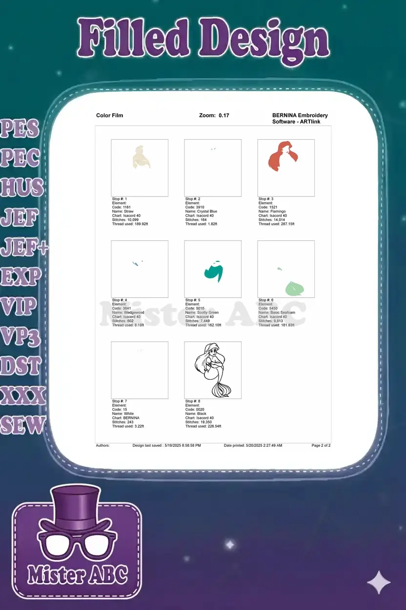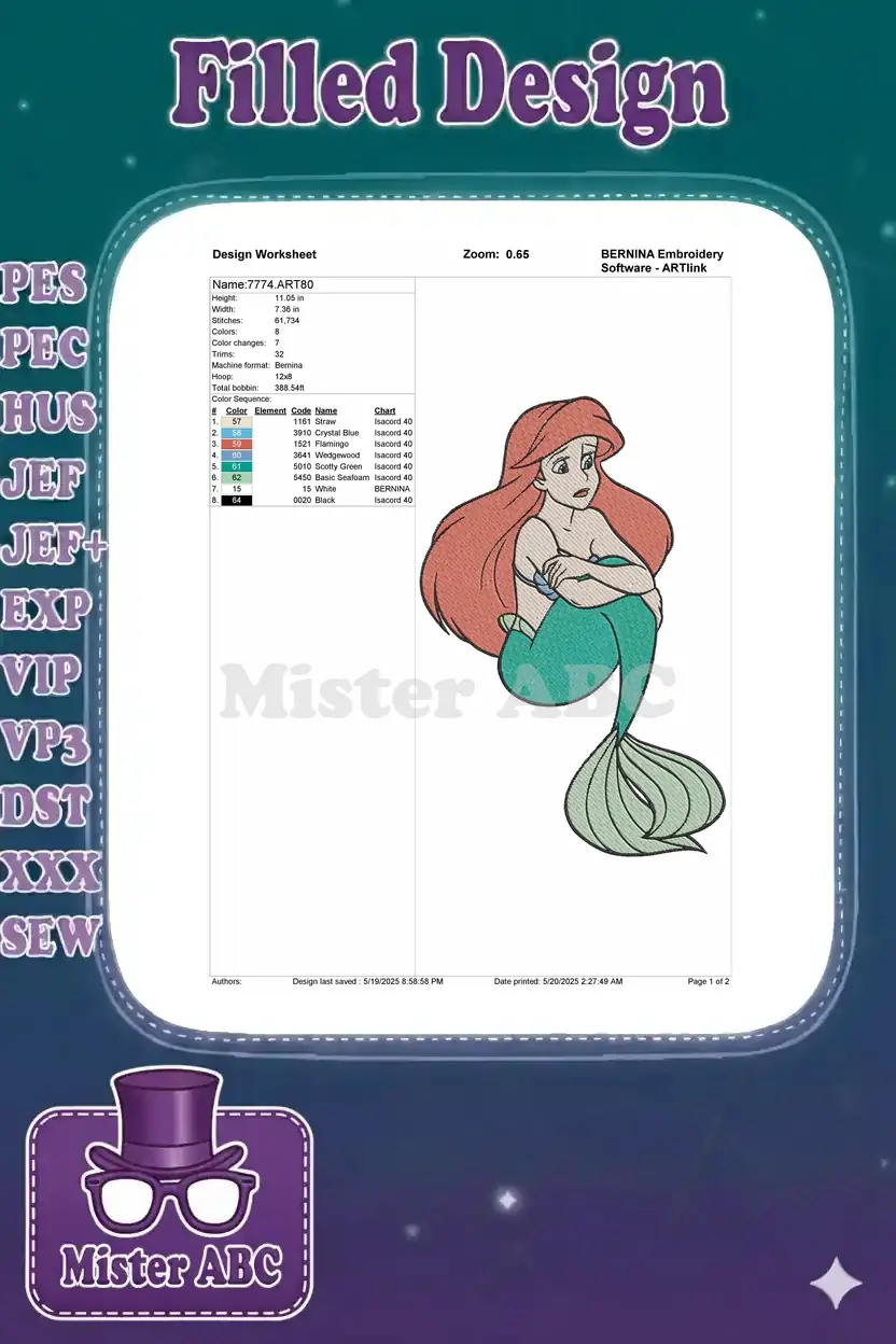 Disney Little Mermaid Ariel sad worried princess embroidery designs