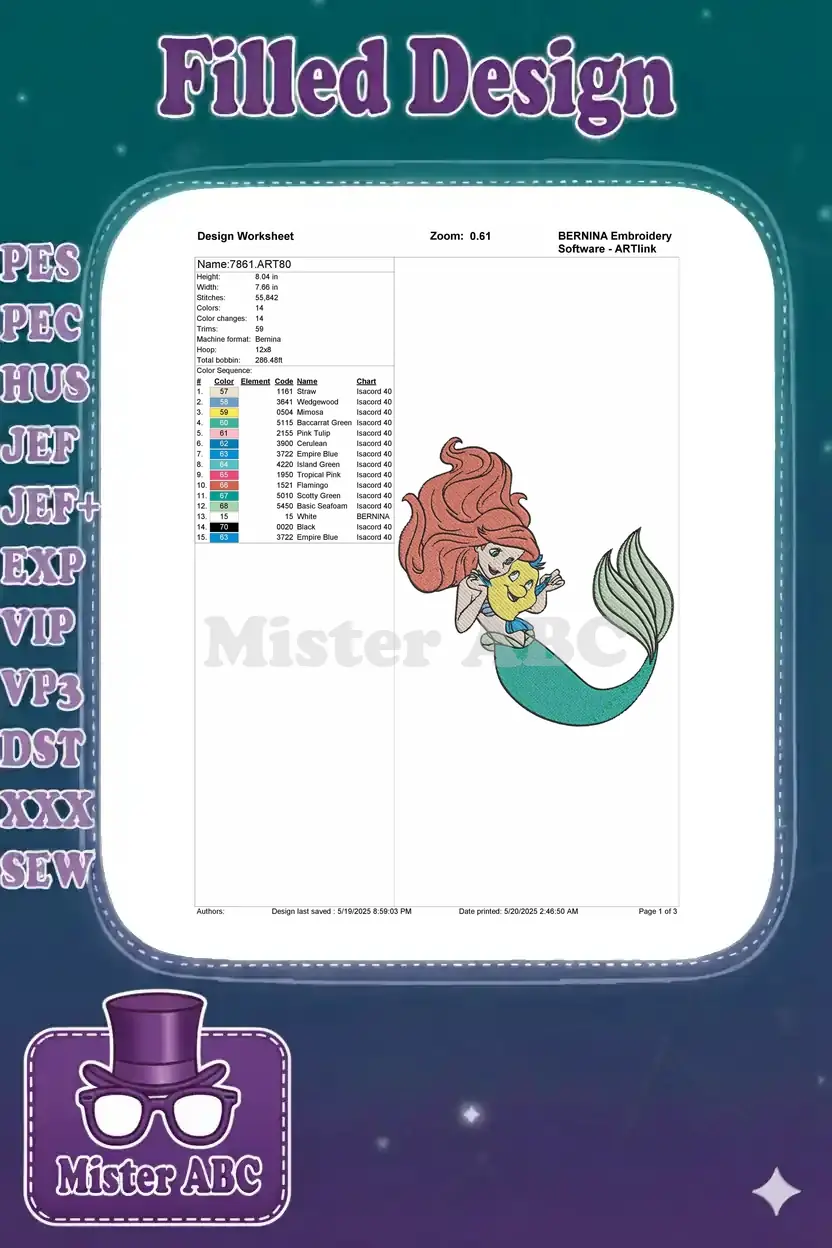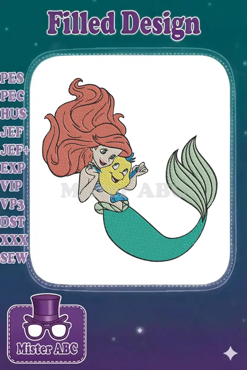 Disney Little Mermaid Ariel and Flounder friendship embroidery designs