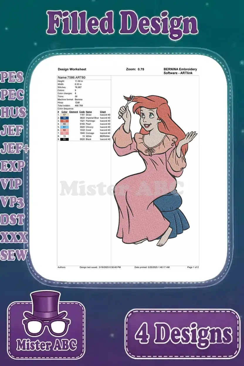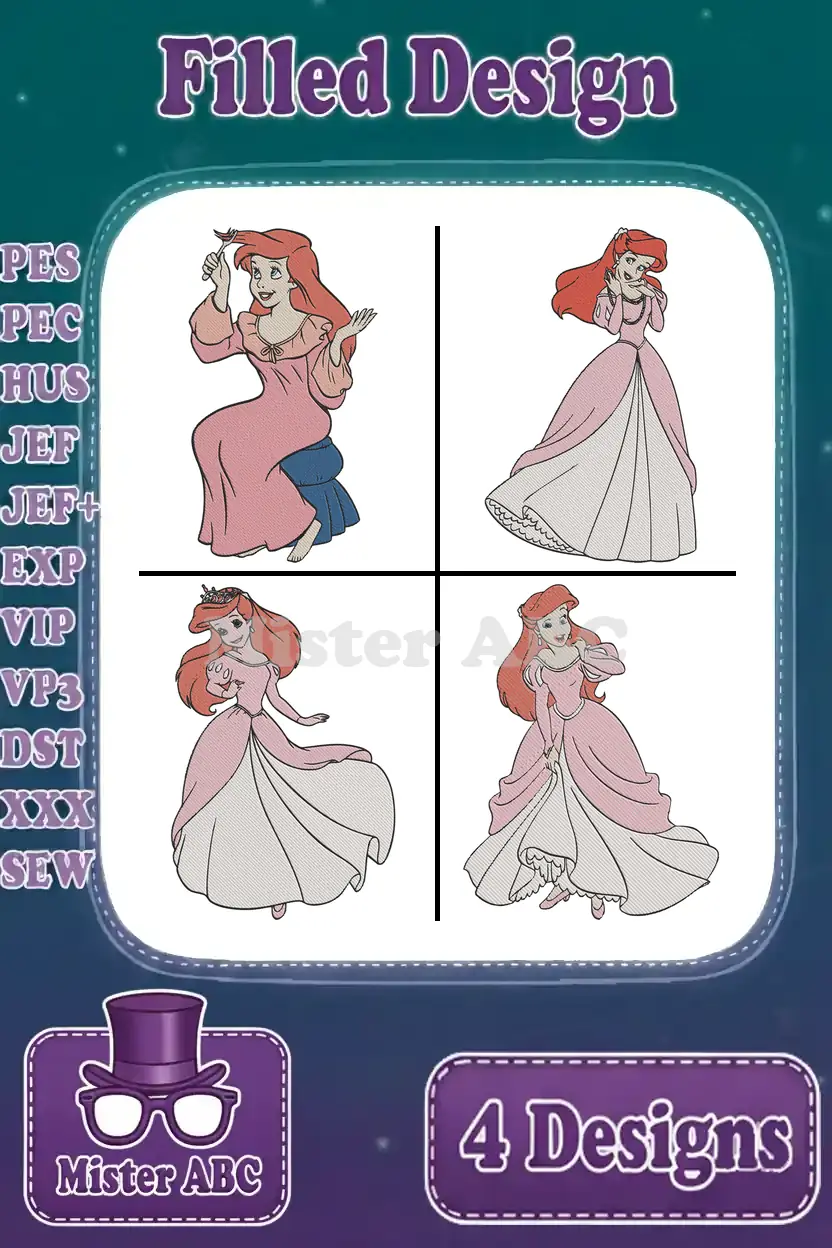 Enchanting bundle of four Ariel filled embroidery designs, perfect for adding princess magic to any project. Detailed and vibrant for fans!