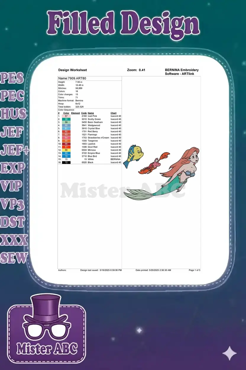 Dive into enchantment with this vibrant embroidery design featuring Ariel, Flounder, and Sebastian from The Little Mermaid. Perfect for adding a touch of underwater magic to any project.