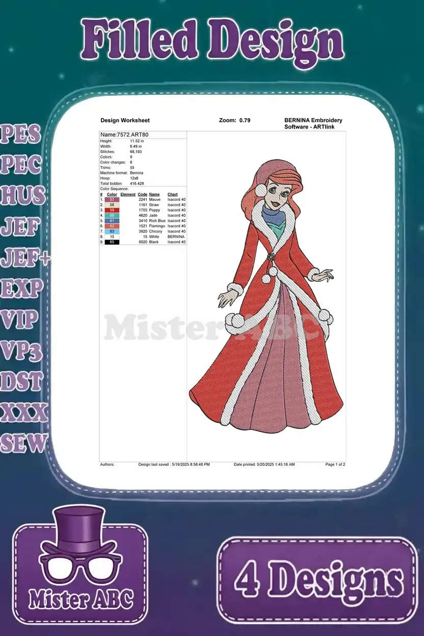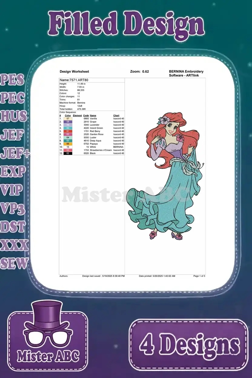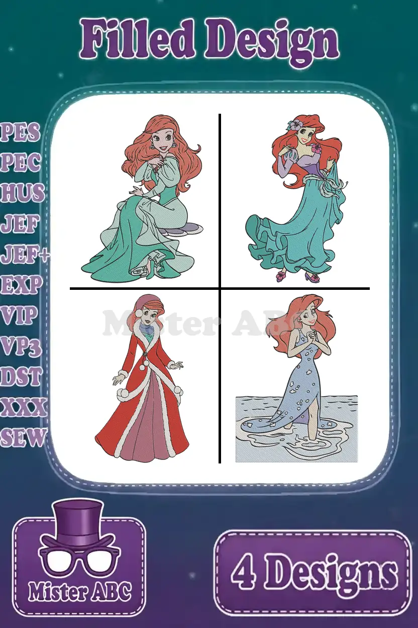 Disney Little Mermaid Ariel Green Red Dresses Walking On Land Human Form – Filled Embroidery Design