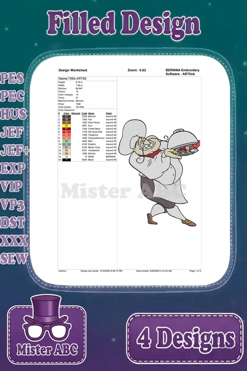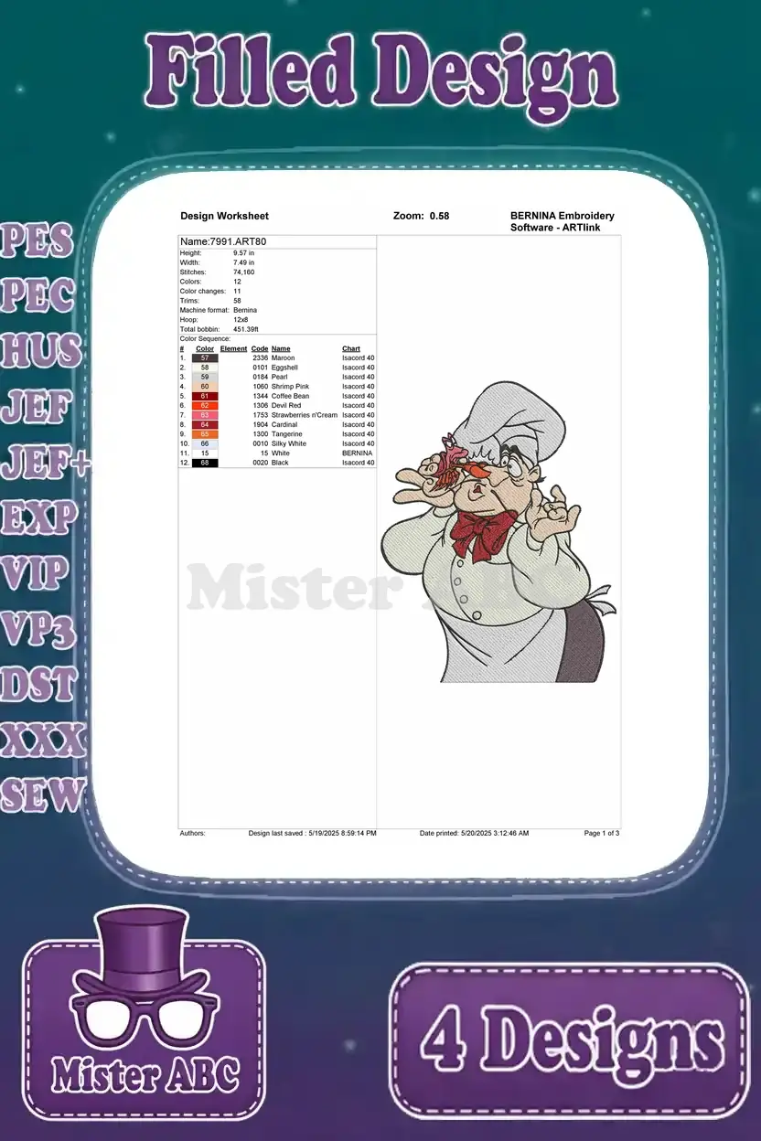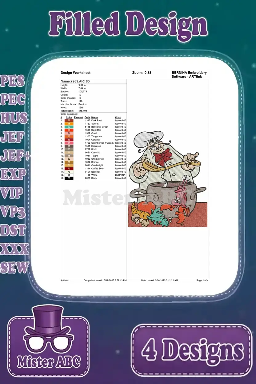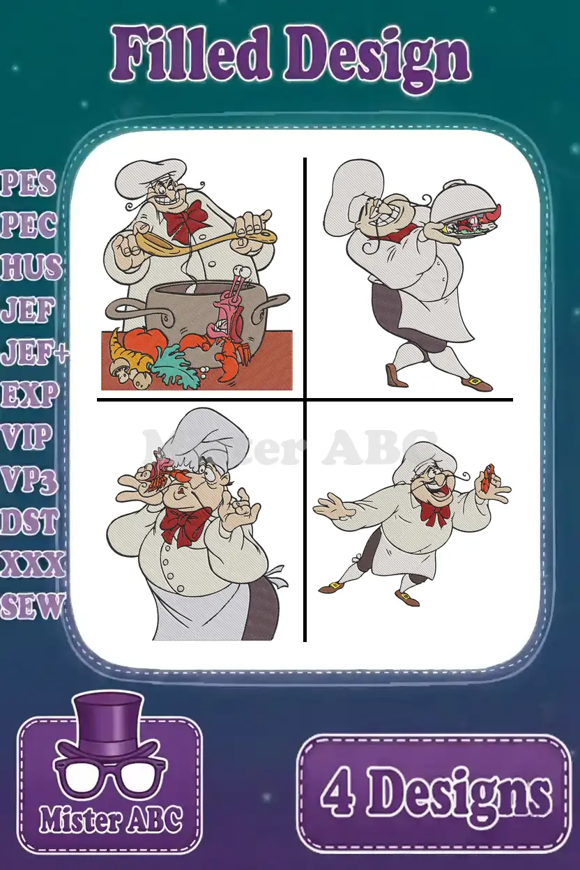 Disney Little Mermaid Chef Louis Preparing Seafood Funny Kitchen Scenes Set – Filled Embroidery Design
