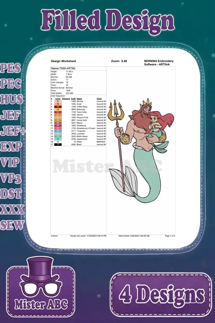 Disney Little Mermaid King Triton Ariel Baby Seal Ursula Sea Witch Characters – Filled Embroidery Design