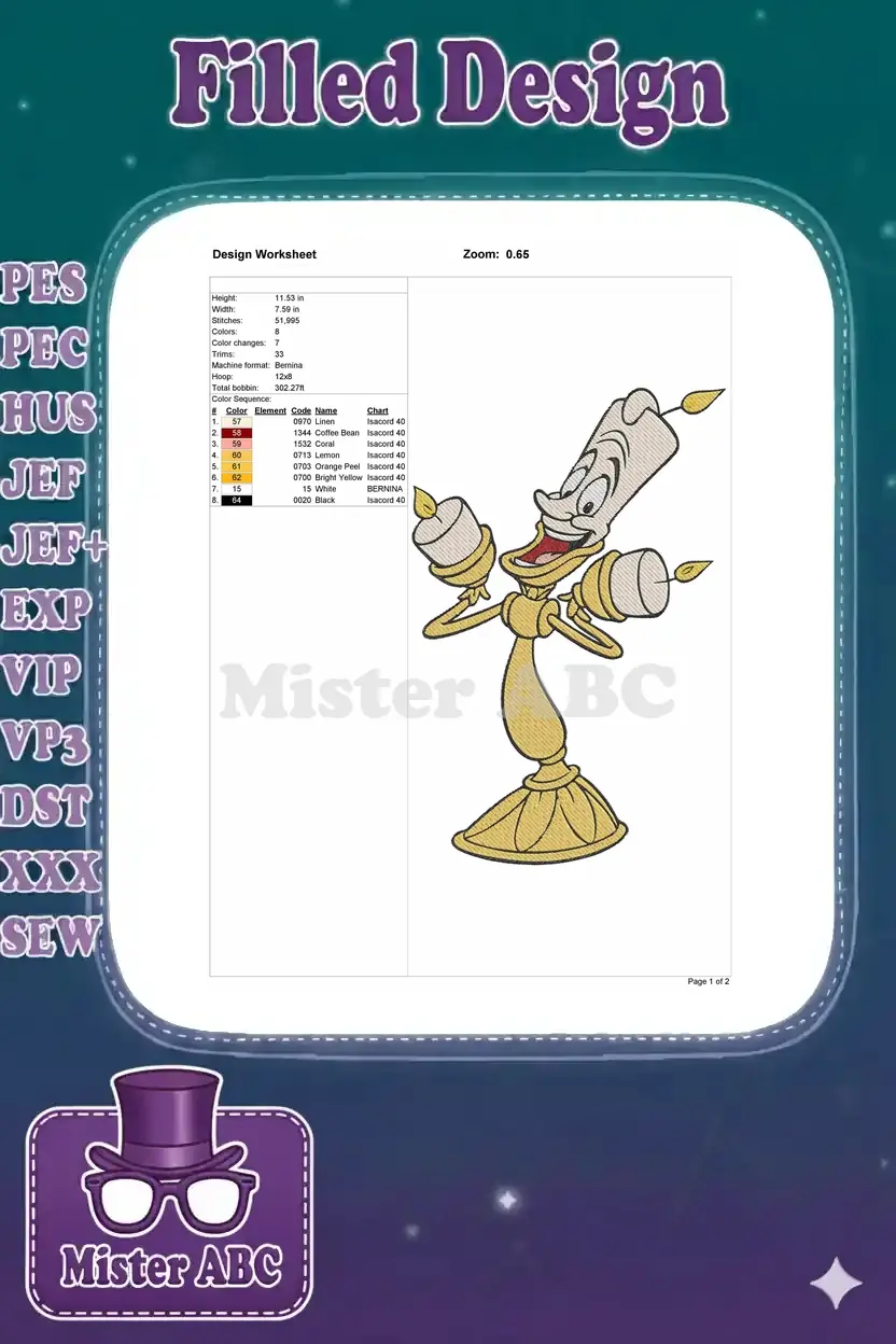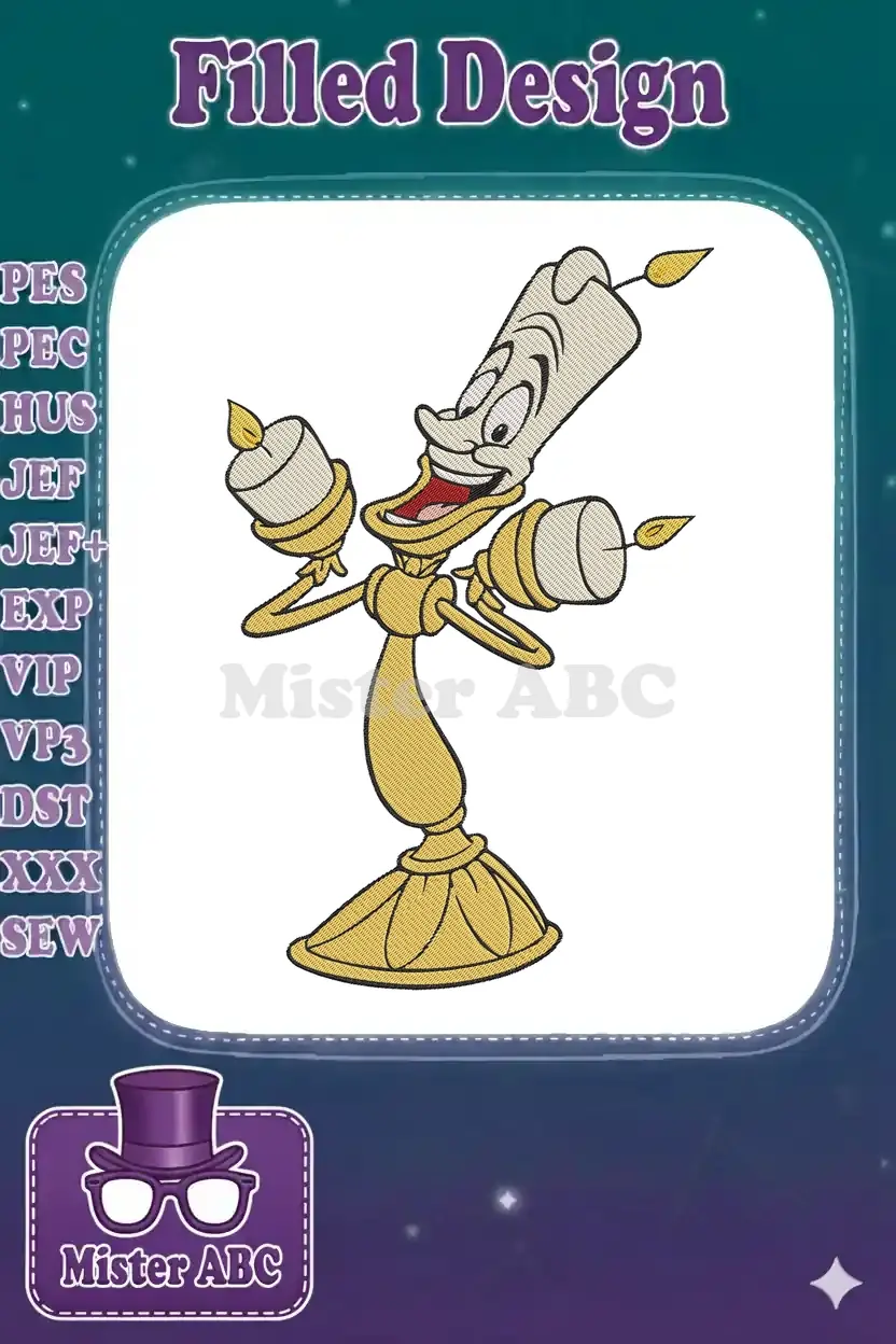 Disney Lumiere Candelabra Character Happy Charming Embroidery Designs