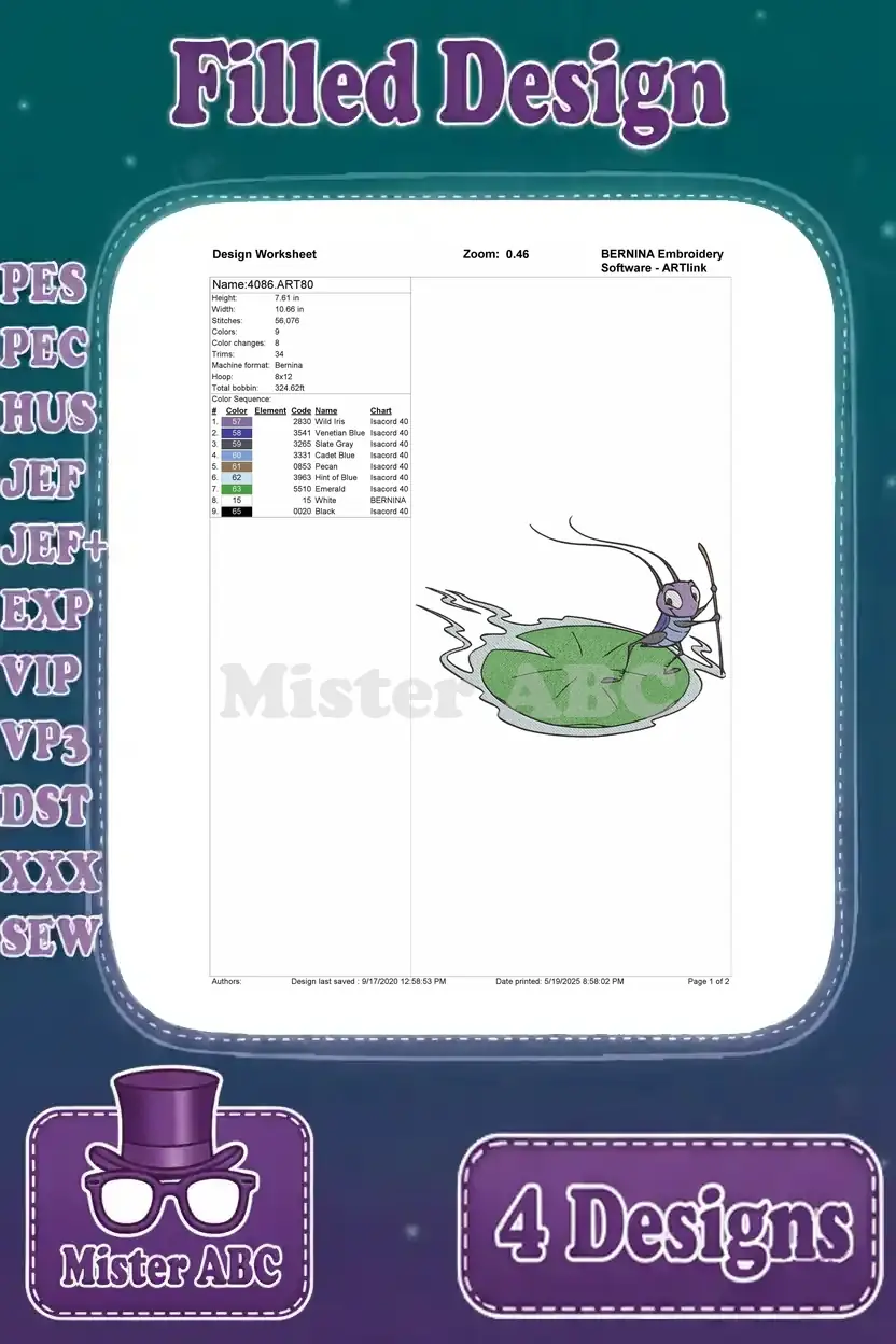 Disney Mulan Cri Kee Lucky Cricket Playing Drum On Lily Pad Character Poses - Filled Embroidery Design - 4087