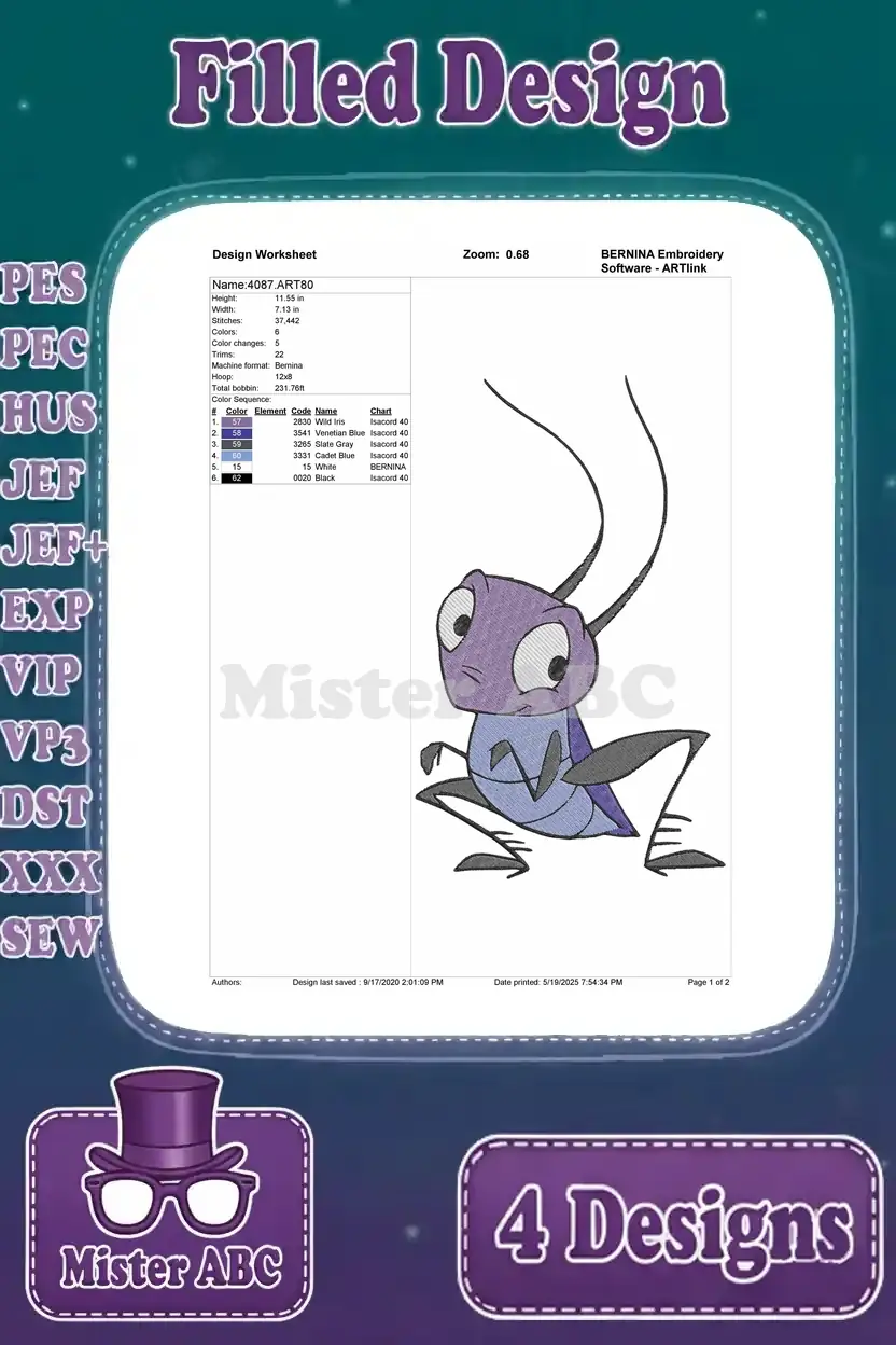 Delightful Jiminy Cricket embroidery bundle featuring four unique, expressive designs perfect for Disney fans and crafters!