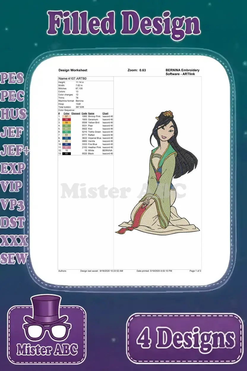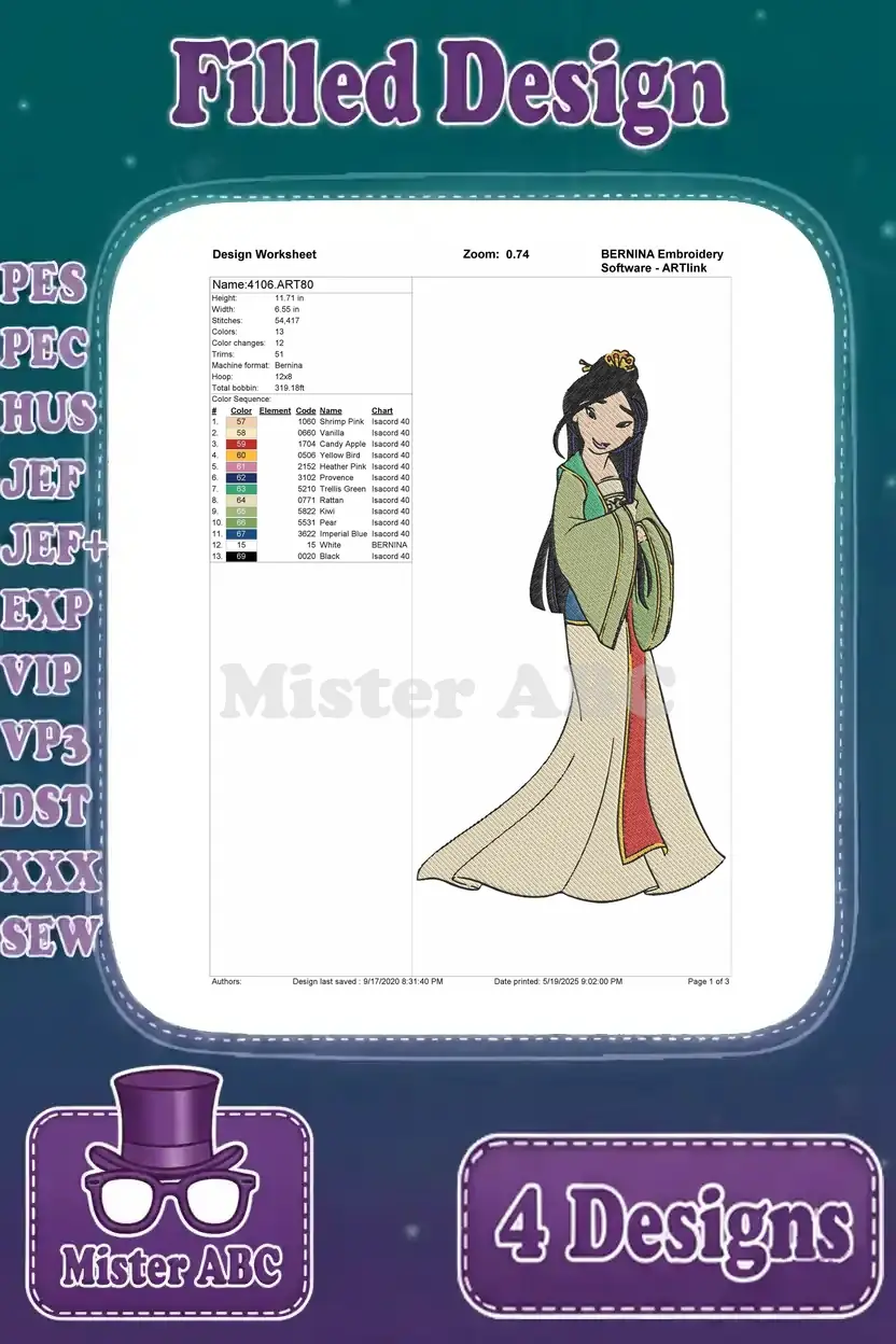 Disney Mulan Fa Mulan Various Outfits Standing Posing Graceful Warrior Princess Designs – Filled Embroidery Design
