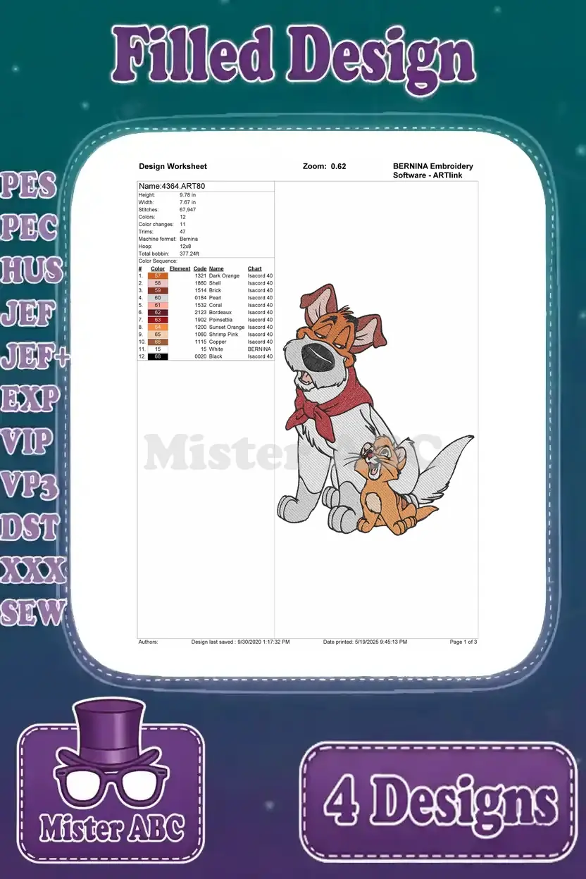 Delightful Oliver & Dodger embroidery bundle featuring four charming filled designs. Perfect for fans of the classic animated tale.