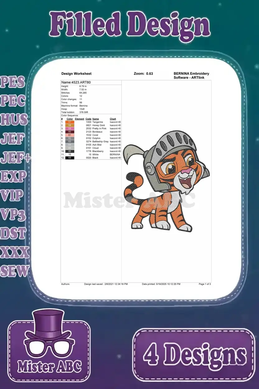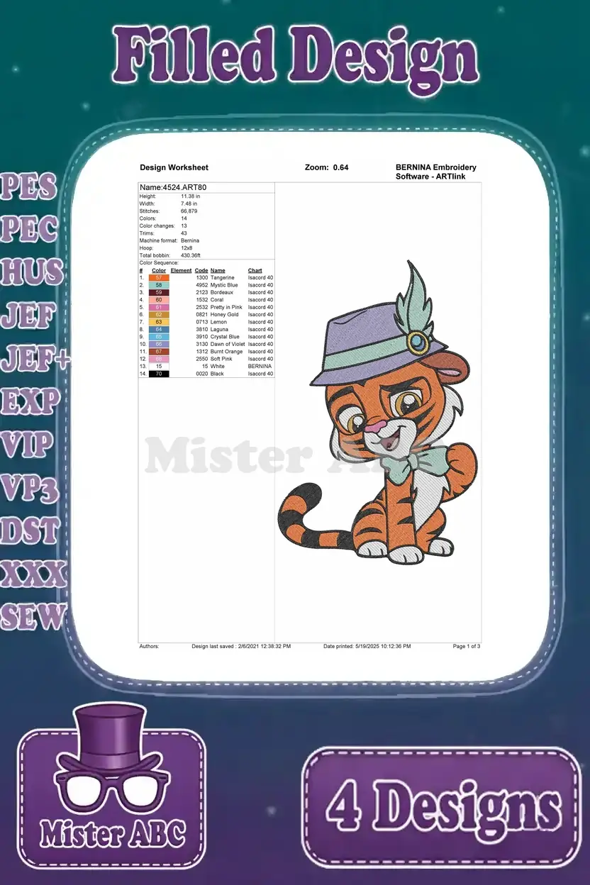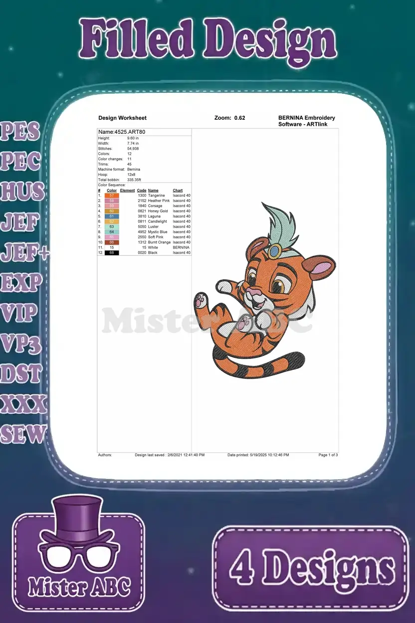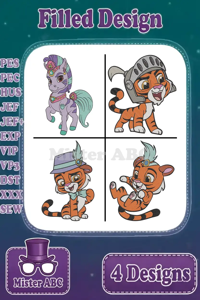 Disney Palace Pets Jasmines Tiger Sultan Various Royal And Playful Poses – Filled Embroidery Design