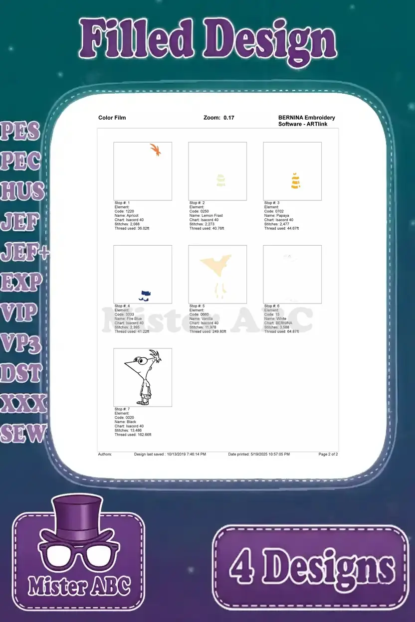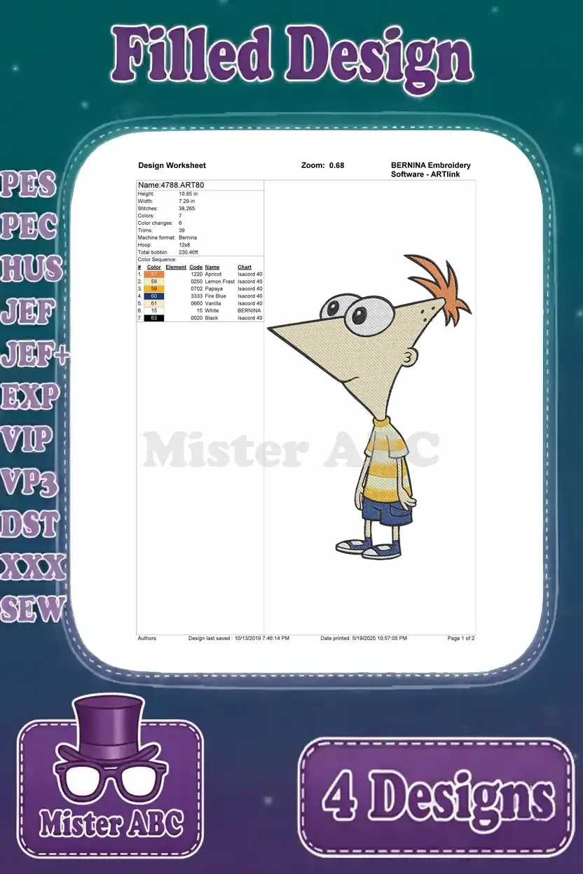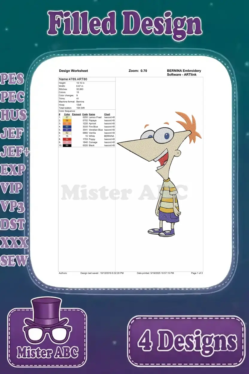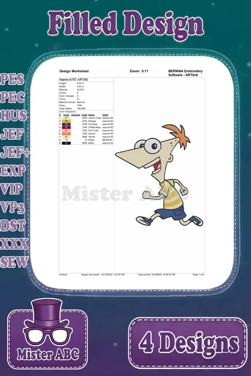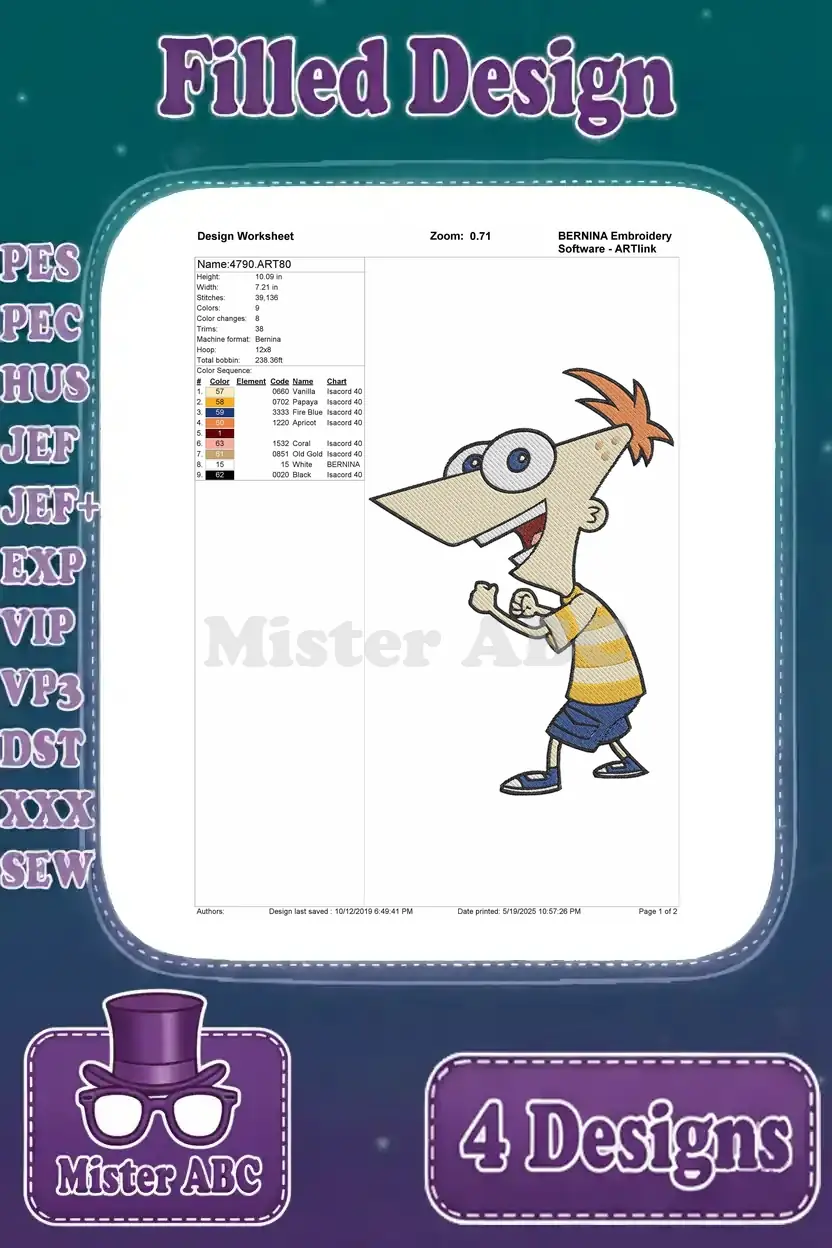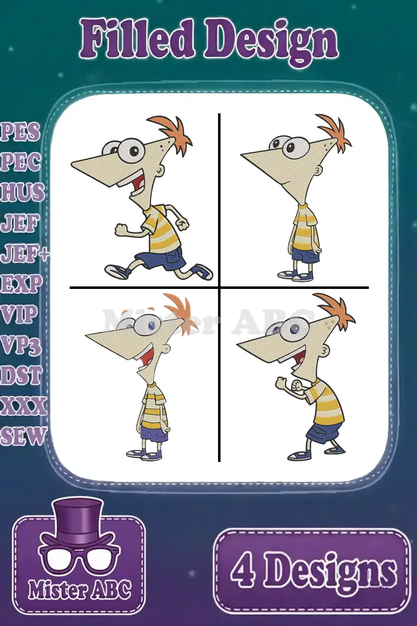 Disney Phineas And Ferb Phineas Flynn Red Haired Inventor Various Happy Poses Bundle – Filled Embroidery Design