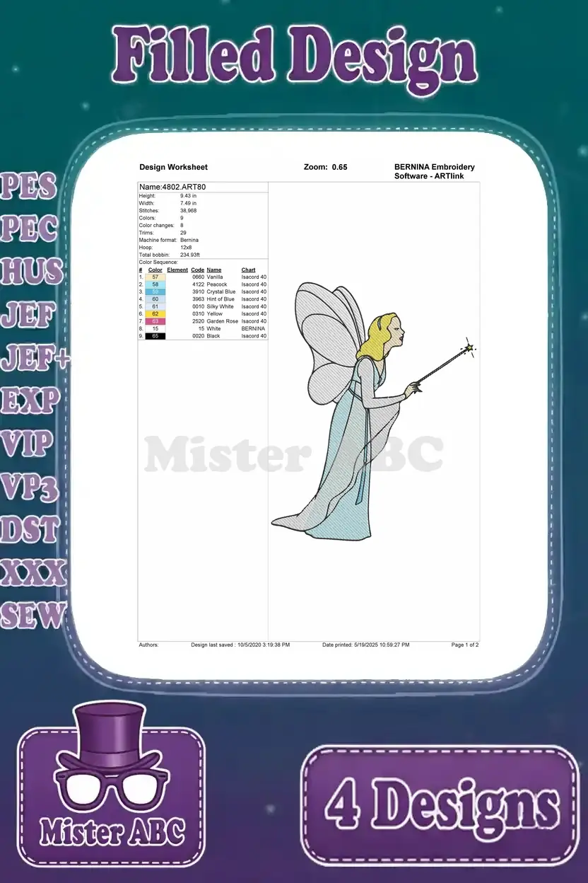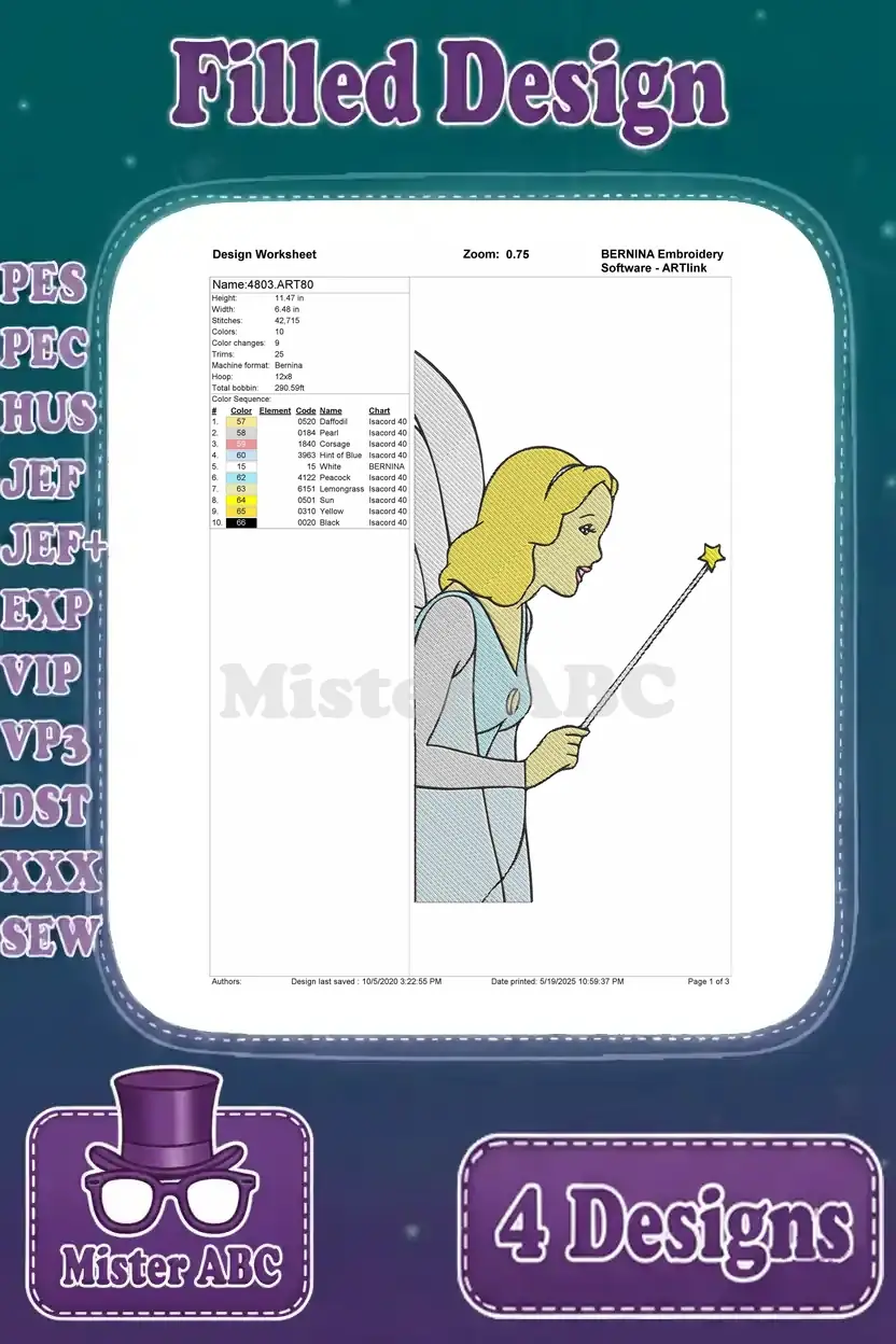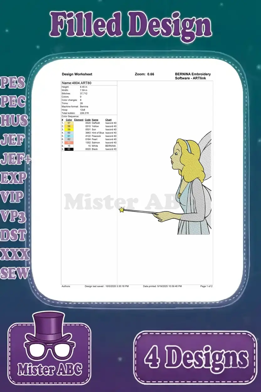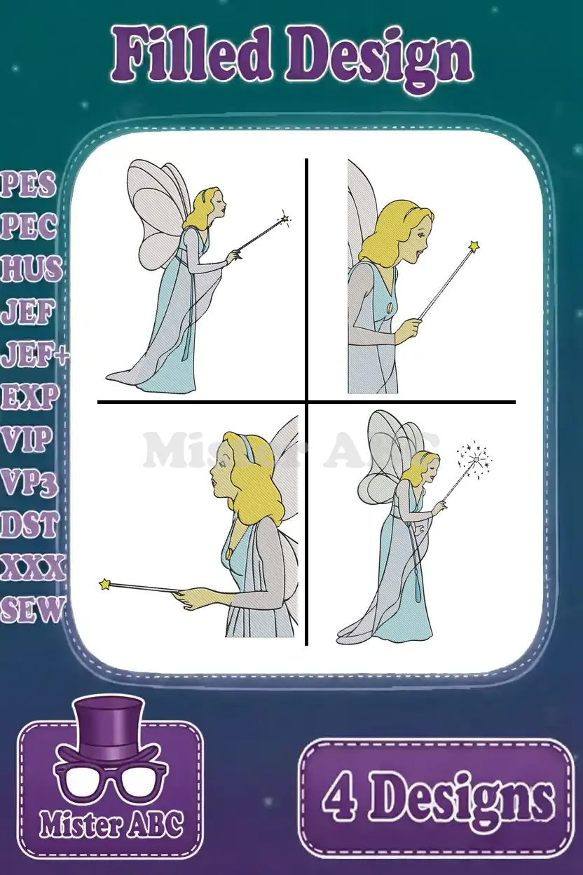 Disney Pinocchio Blue Fairy Magic Wand Granting Wishes Elegant Fairy Poses – Filled Embroidery Design