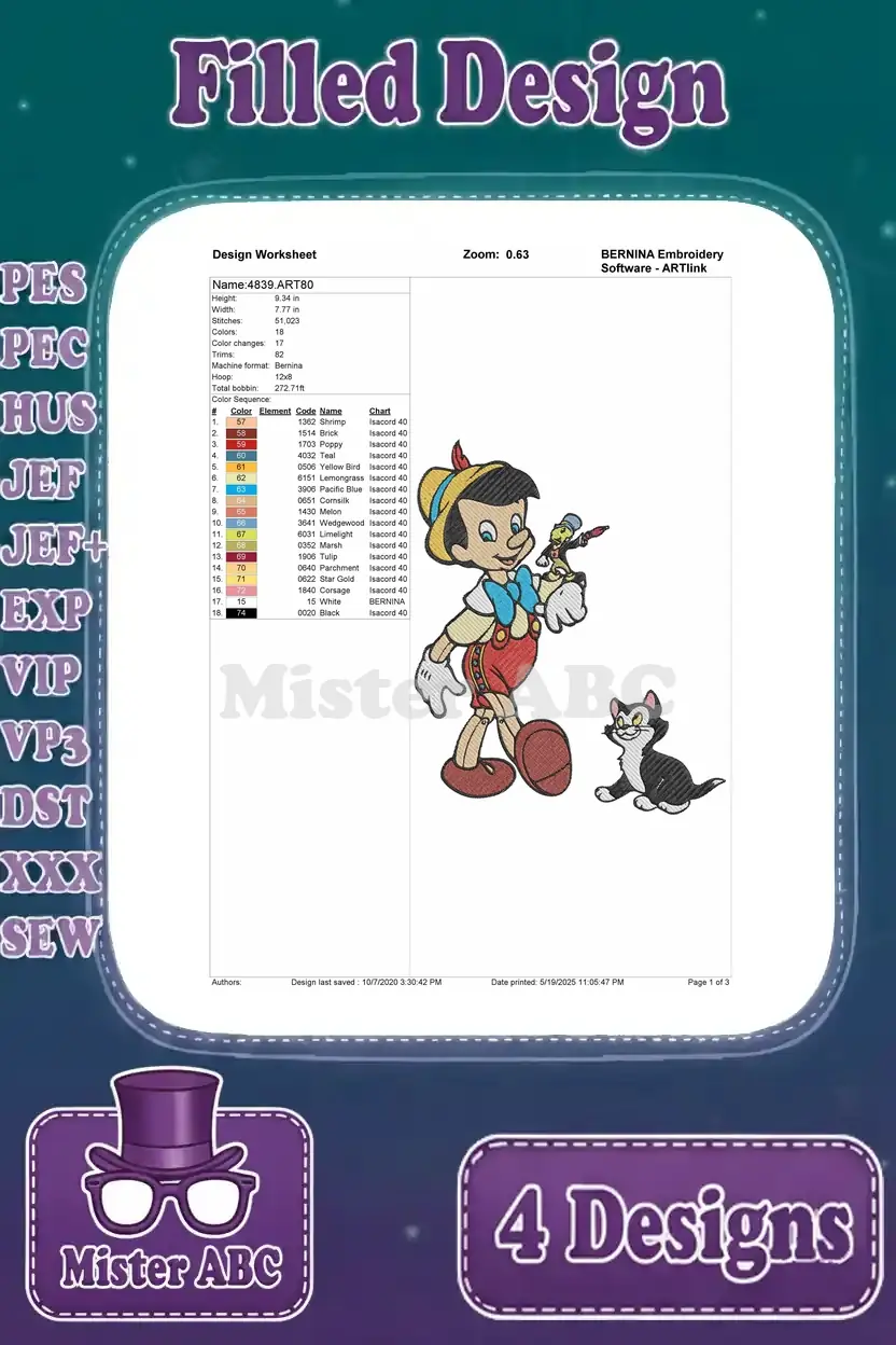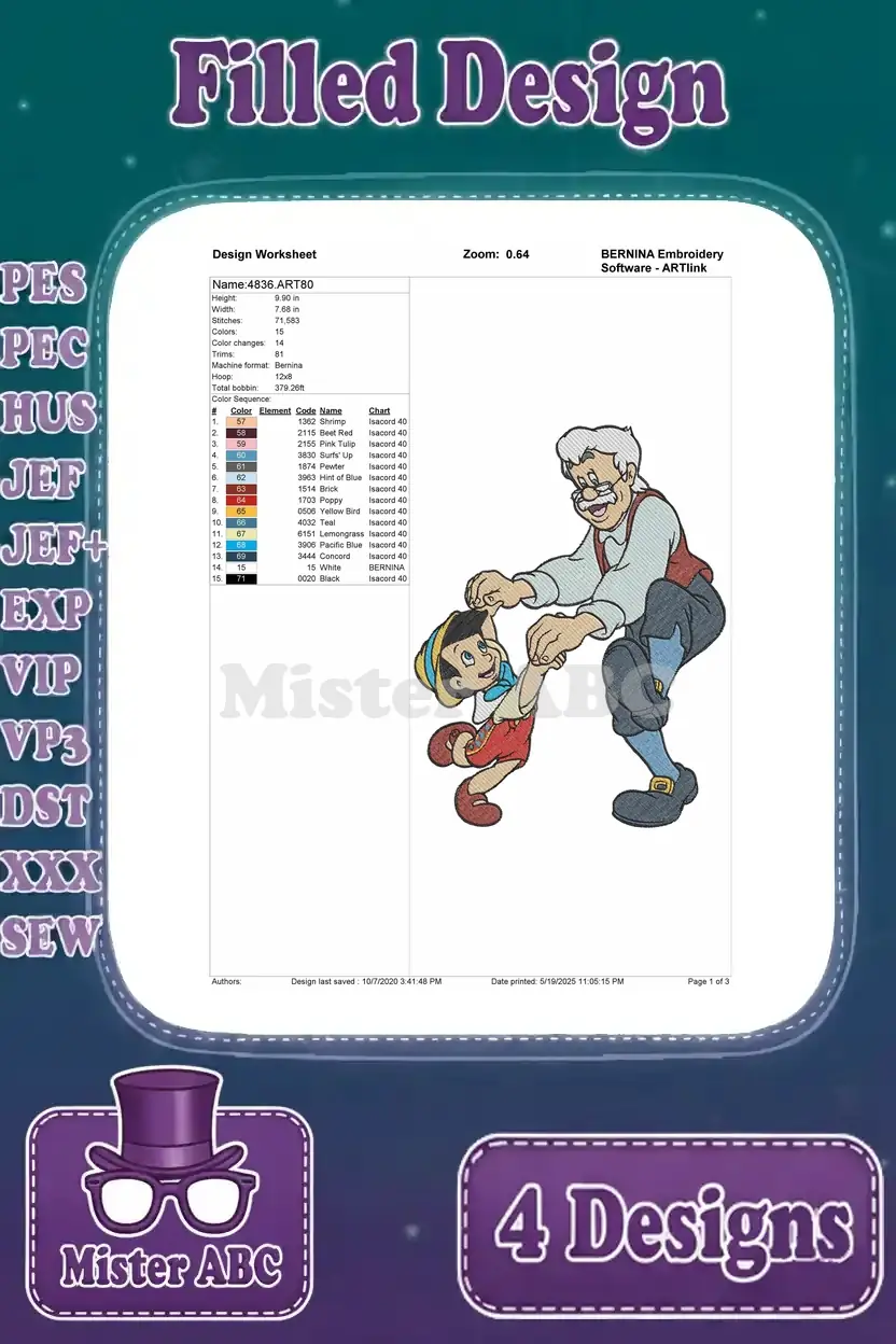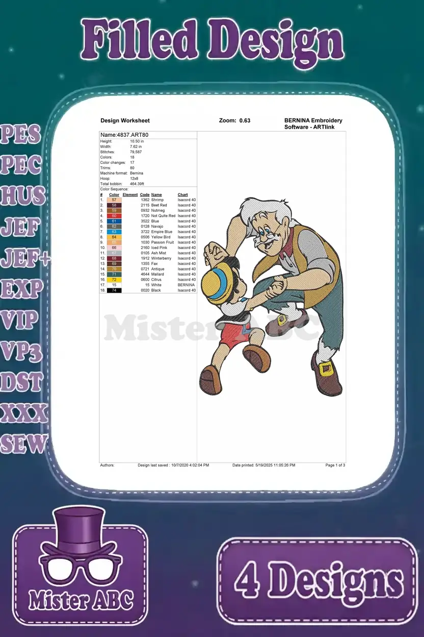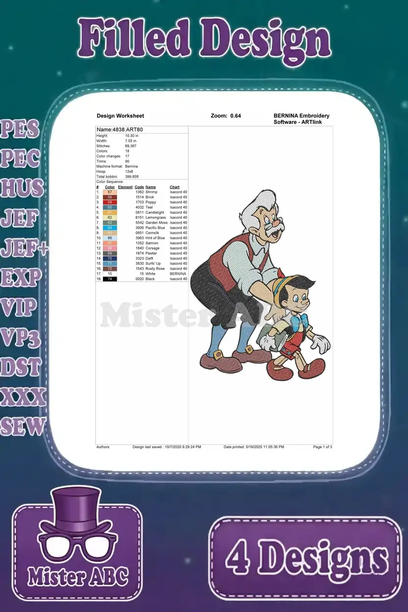 Disney Pinocchio Geppetto And Pinocchio Dancing Playing Puppet Boy Love – Filled Embroidery Design
