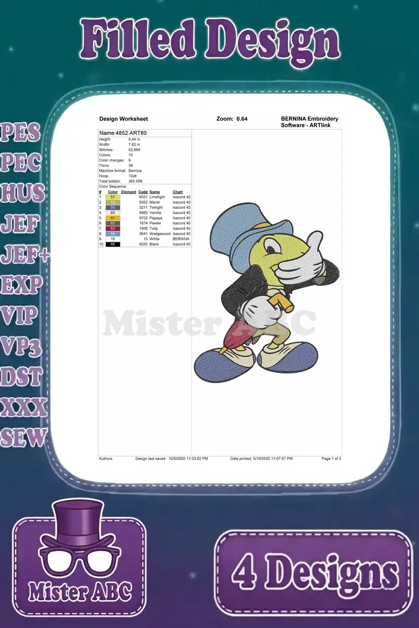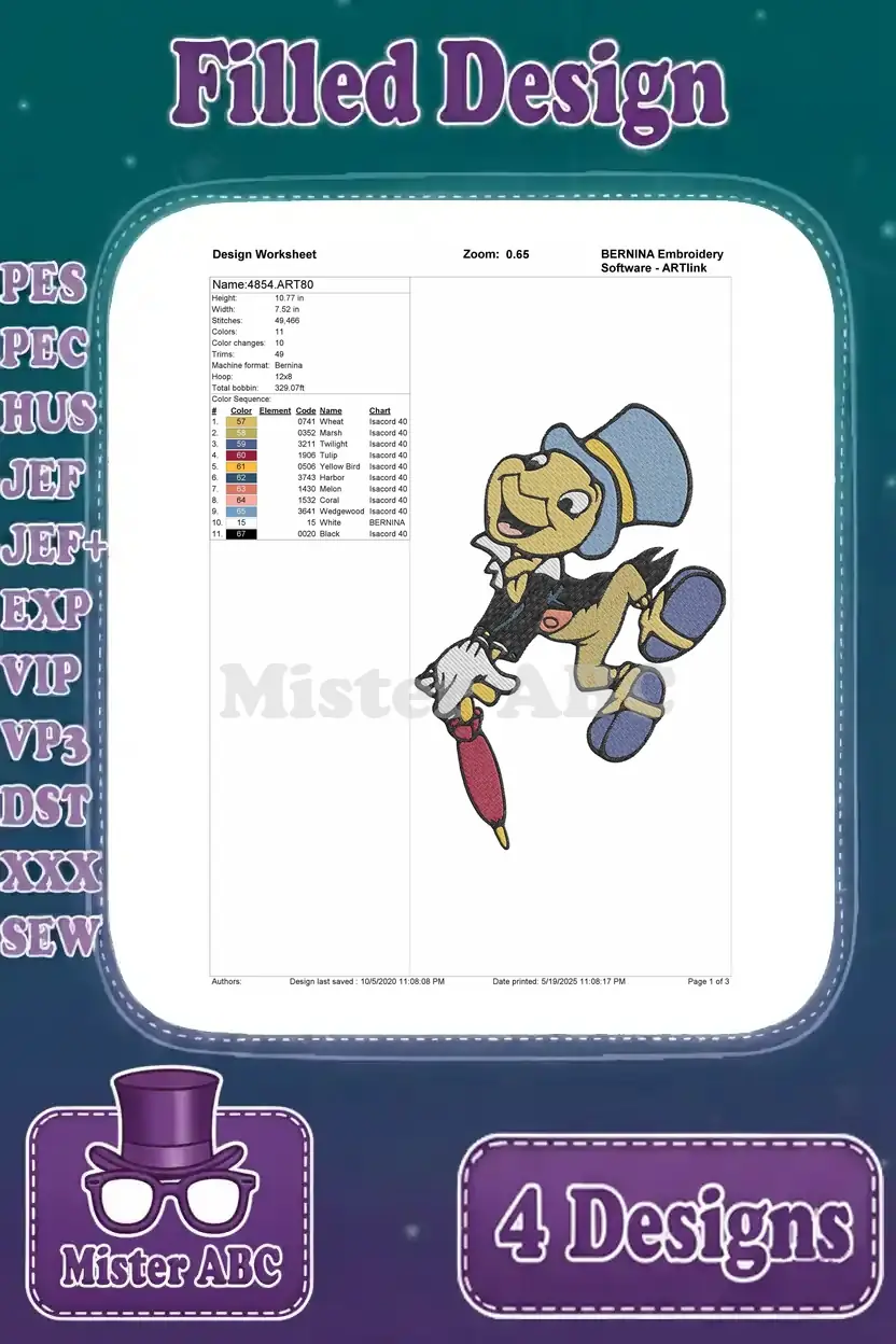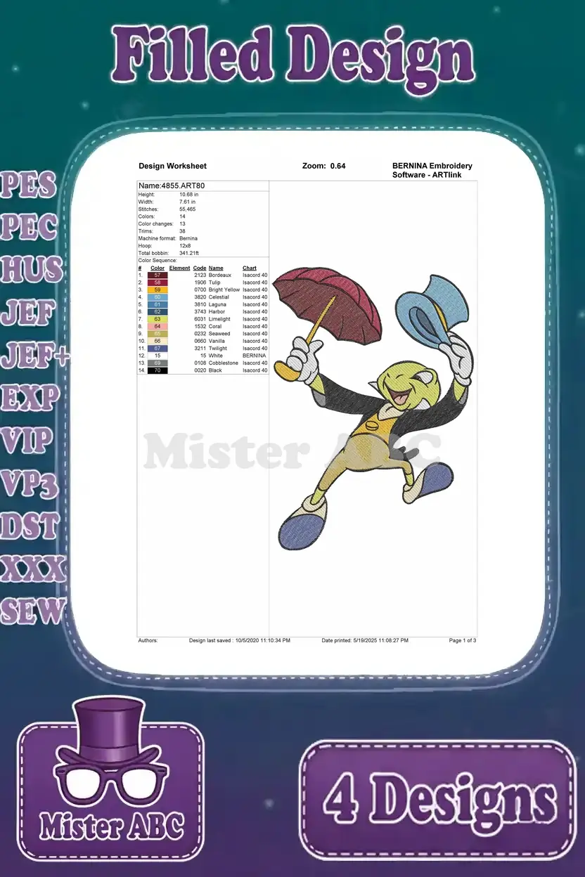 Disney Pinocchio Jiminy Cricket Floating With Umbrella Happy Thoughtful Poses – Filled Embroidery Design