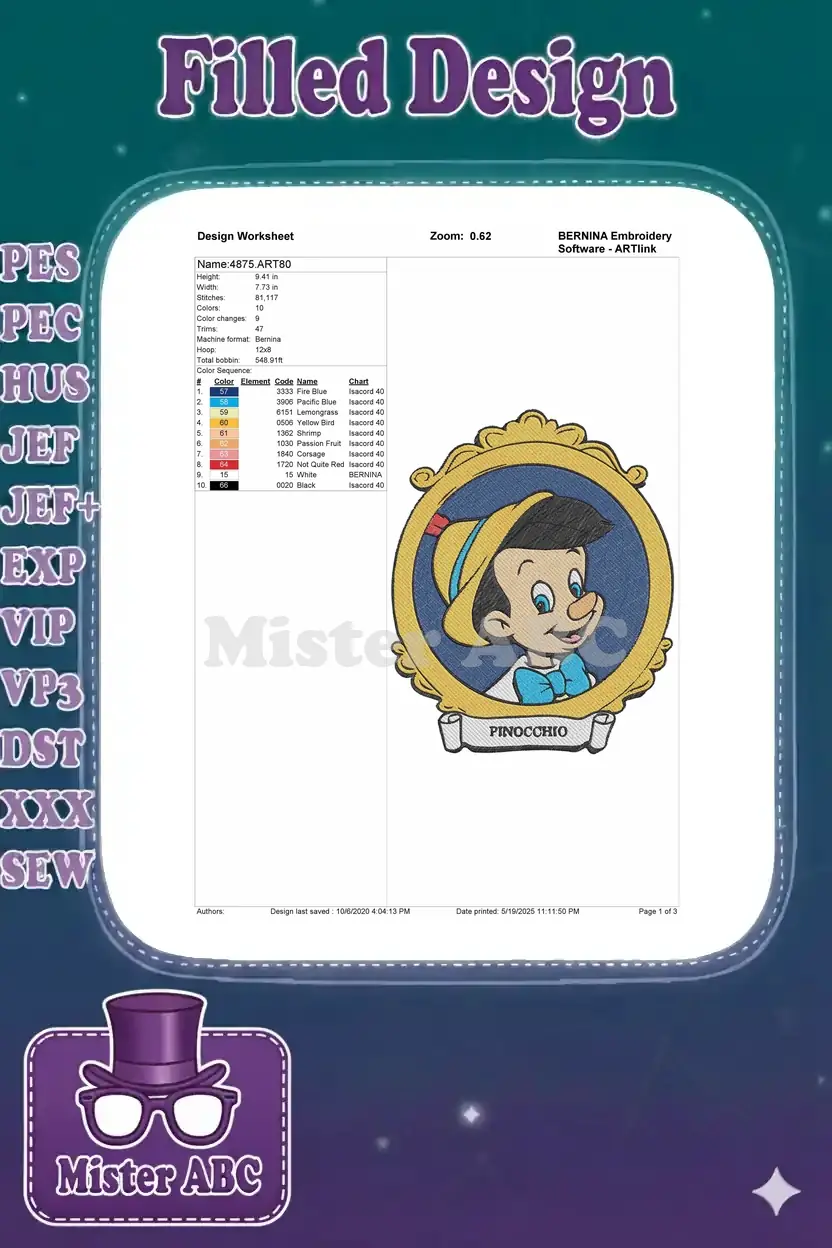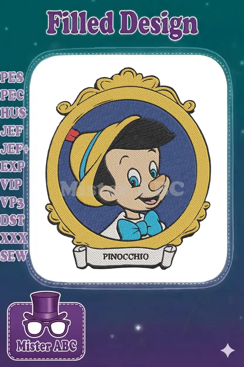 Charming Pinocchio embroidery design, featuring the beloved character in an elegant golden frame. Perfect for custom apparel and decor.