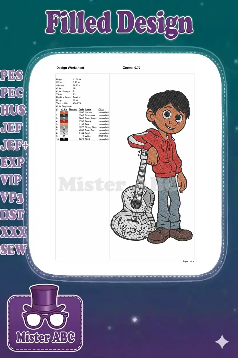 Capture the vibrant spirit of Miguel from Disney’s Coco with this detailed embroidery design, perfect for fans.