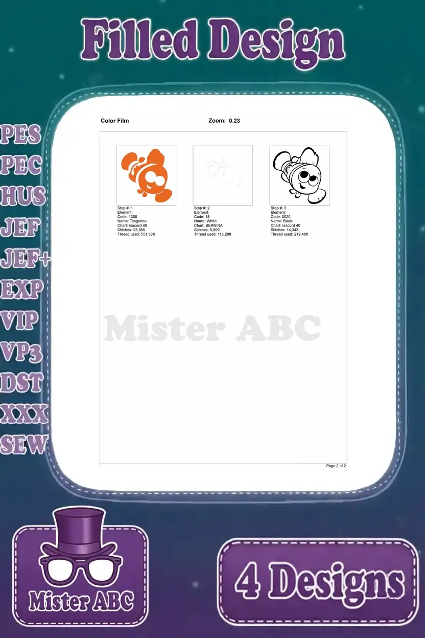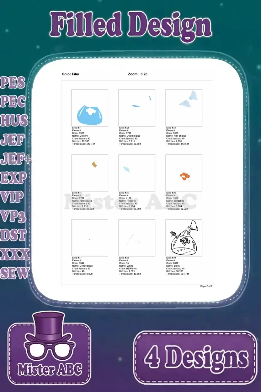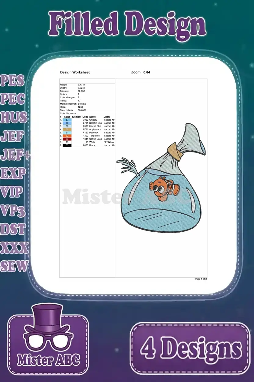 Disney Pixar Finding Nemo Clownfish In Bag Smiling Sad Expressions Little Fish Set – Filled Embroidery Design
